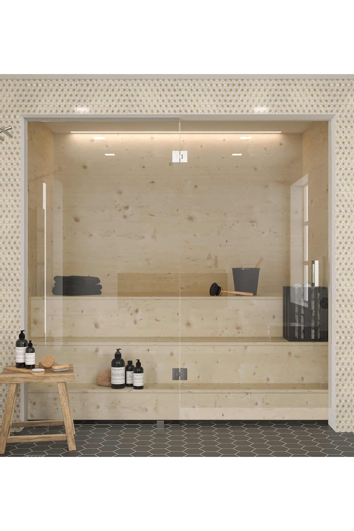 The product is suitable for sauna space division. The door does not have any frames, the hinges are mounted directly to the side panel on the hinge side. The side panels add light and the feeling of spaciousness to the space.