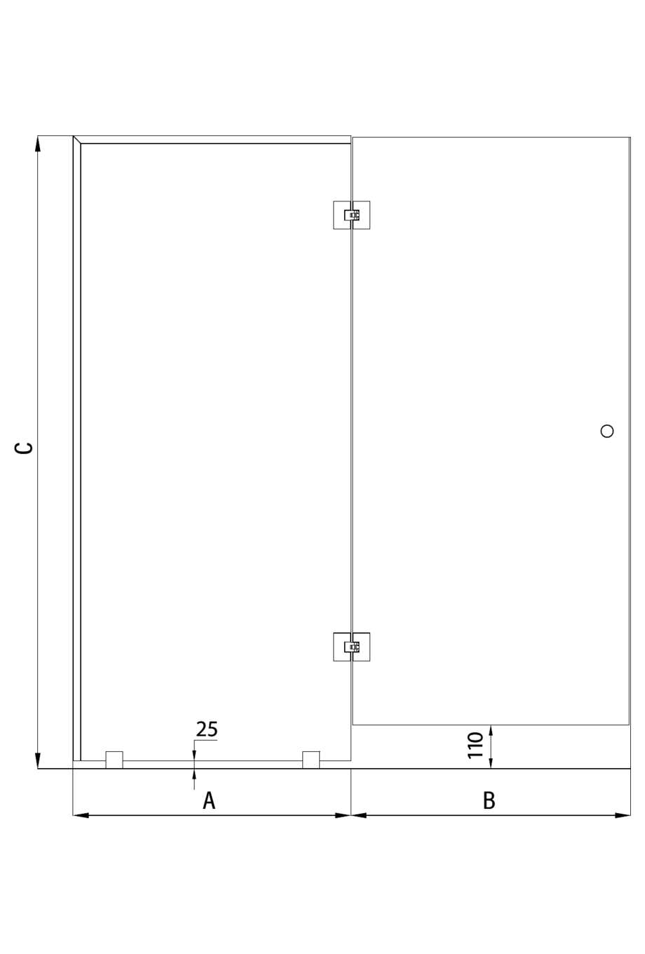 The size of the shower door and the side panels are always manufactured by special dimensions. When selecting the size of the door, the width is the width of the installation opening and the height is the height of the installation opening. When dimensioning the height of the installation opening of the door, a 5mm reserve is automatically left at the top edge of the panel and a 110mm reserve is left at the bottom edge. When selecting the side panel, the width and the height are the width and the height of the installation opening. The installation and adjustment ranges are included automatically in the dimensioning of the panel panes of the side panels.If the size of the door exceeds 1.7m2 an additional hinge is necessary to provide additional support.