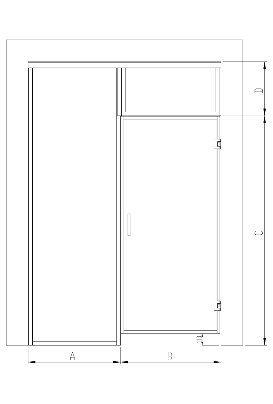 Sauna doors are always made to measure. When selecting the size of the door and the upper panel, the width is the width of the installation opening and the height is the height of the panel pane. When measuring the height of the installation opening of the door, a 5mm reserve is automatically left at the top edge of the panel and a 110mm reserve is left at the bottom edge. When selecting the side panels, the width and the height are the width and the height of the installation opening. Installation and adjustment ranges are included automatically in the dimensioning of the panel panes of the side panels. If the size of the door exceeds 1.7m2 an additional hinge is necessary to provide additional support.