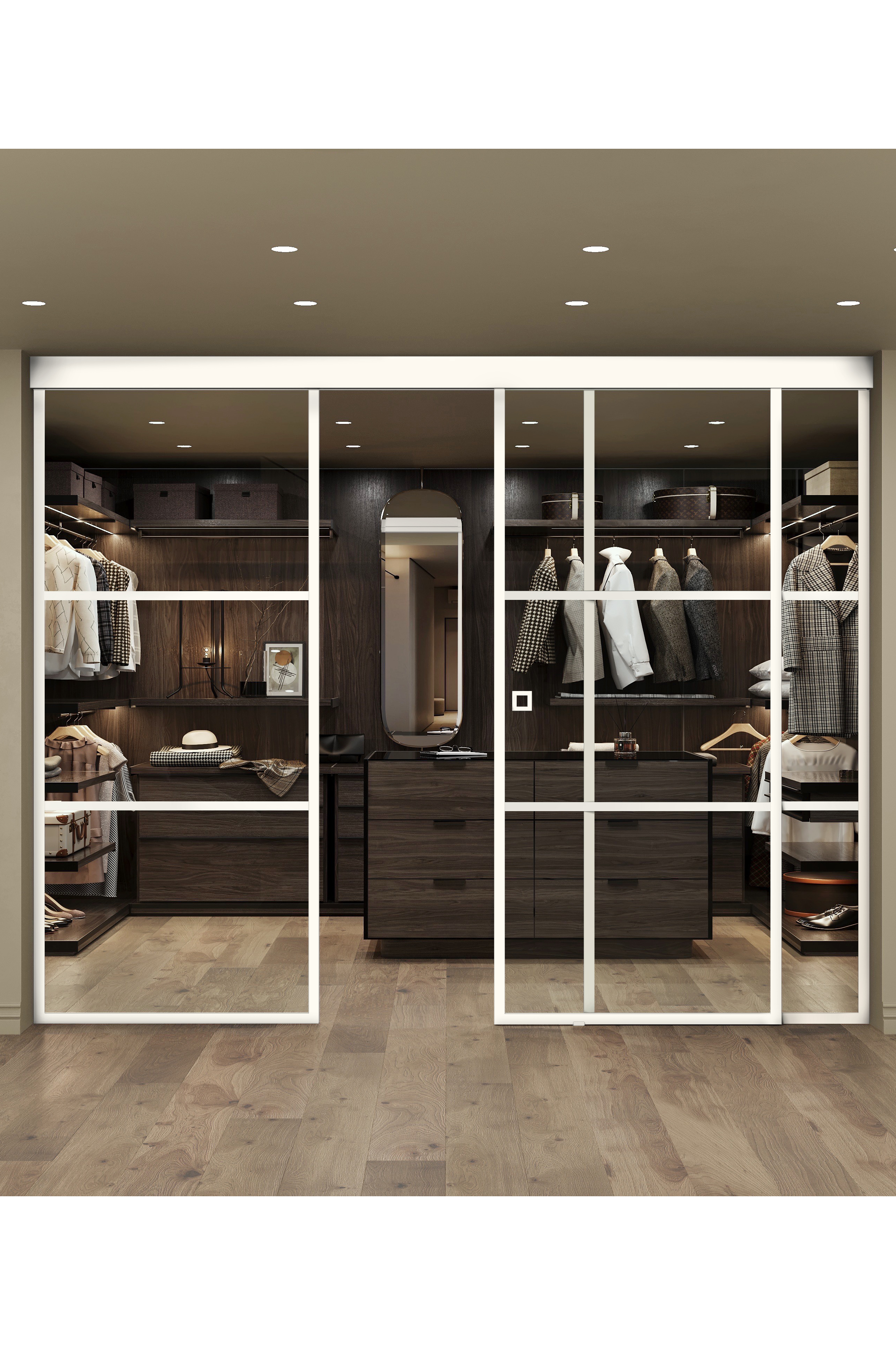 The sliding door with two fixed panels glass wall consists of fixed wall panels,a sliding door panel and ceiling mounted sliding mechanism. Sliding door fixture takes up very little space in the room, a quality sliding mechanism and a floor guide fitting provides a smooth and safe door movement. The doors are equipped with soft closing mechanism which cushions the closing and gently pulls the door into position.