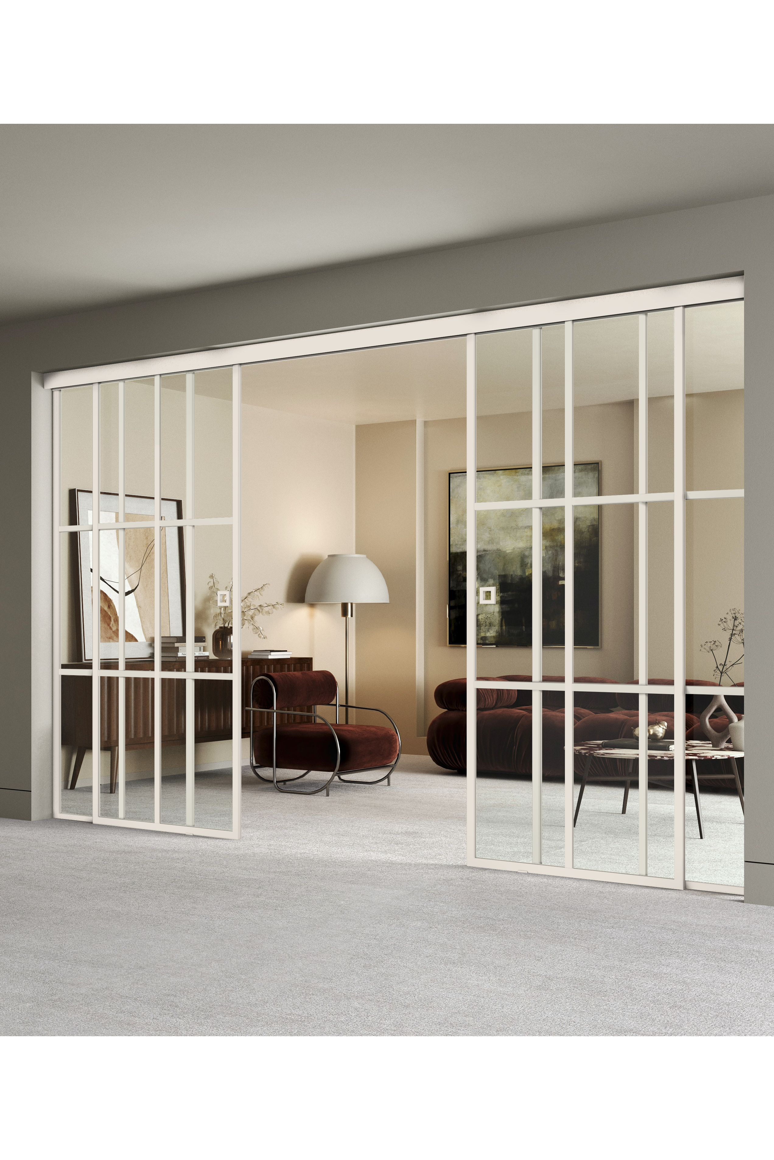The sliding double door with two fixed parts unit consists of two sliding door glass panels, two fixed glass panels and ceiling mounted sliding mechanism.The sliding mechanism is affixed to the top of the door panel before being mounted on the sliding profile.The sliding mechanism is affixed to the top of the door panels before being mounted on the sliding profile.The sliding rail profile is covered from the front and sides with cover plates.