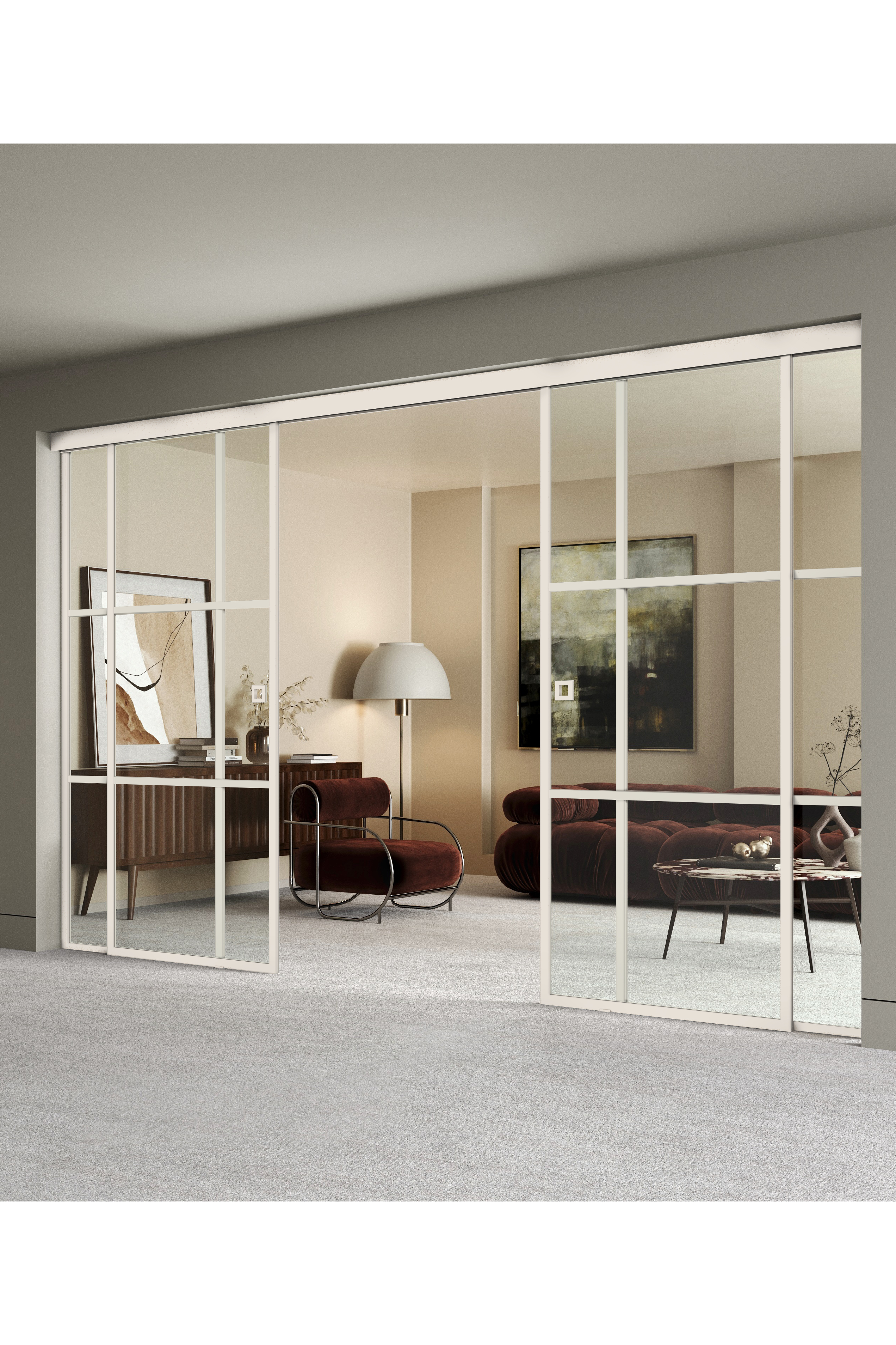 The sliding double door with two fixed parts unit consists of two sliding door glass panels, two fixed glass panels and ceiling mounted sliding mechanism.The sliding mechanism is affixed to the top of the door panel before being mounted on the sliding profile. The sliding mechanism is affixed to the top of the door panels before being mounted on the sliding profile. The sliding rail profile is covered from the front and sides with cover plates.