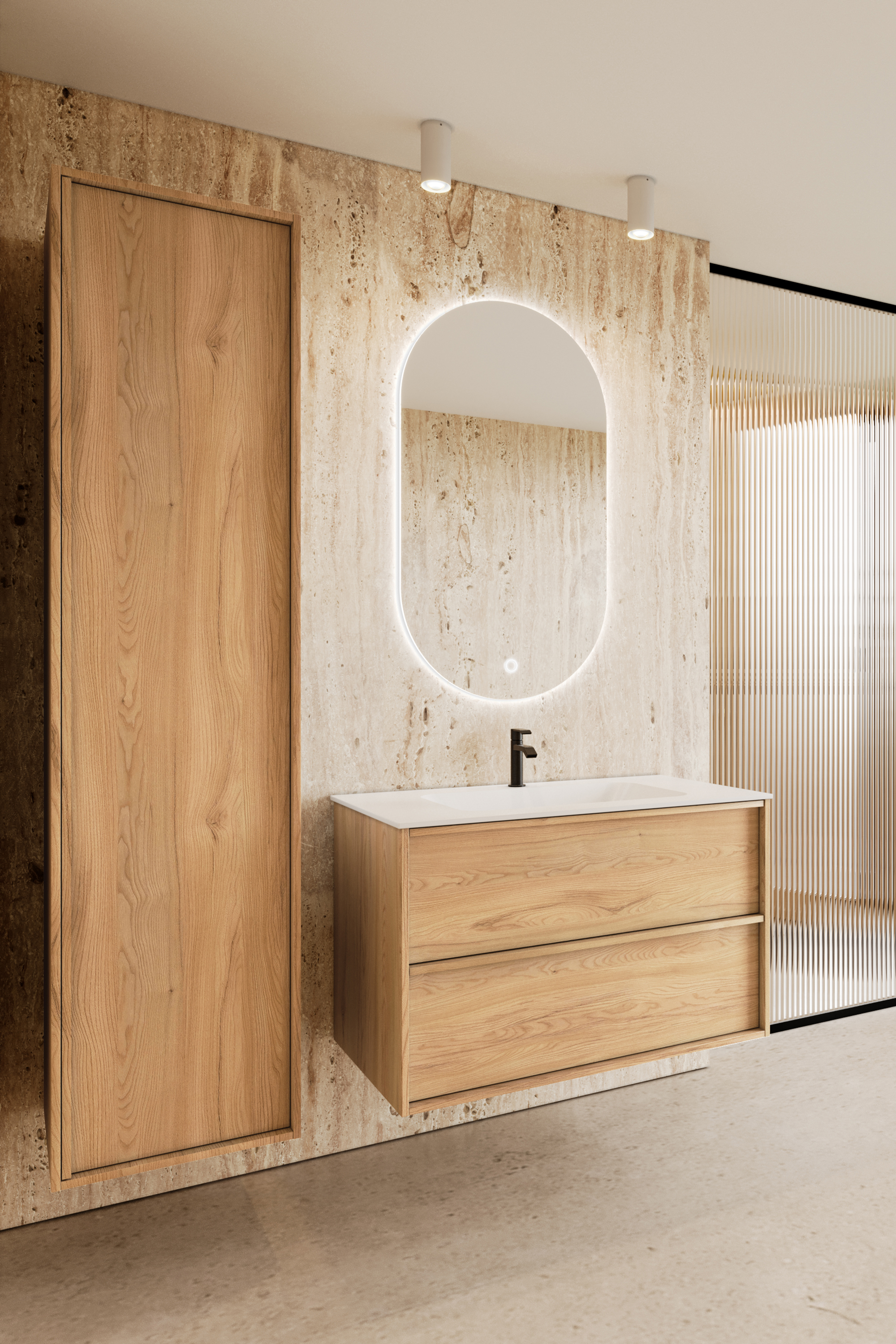 Tall unit bring more storage space to bathroom. Product surface materials are the same as in series vanity units. Tall unit is provided with one door and with an integrated wooden handle. Door handedness is selected when the unit is being mounted. The unit has three adjustable glass shelves.