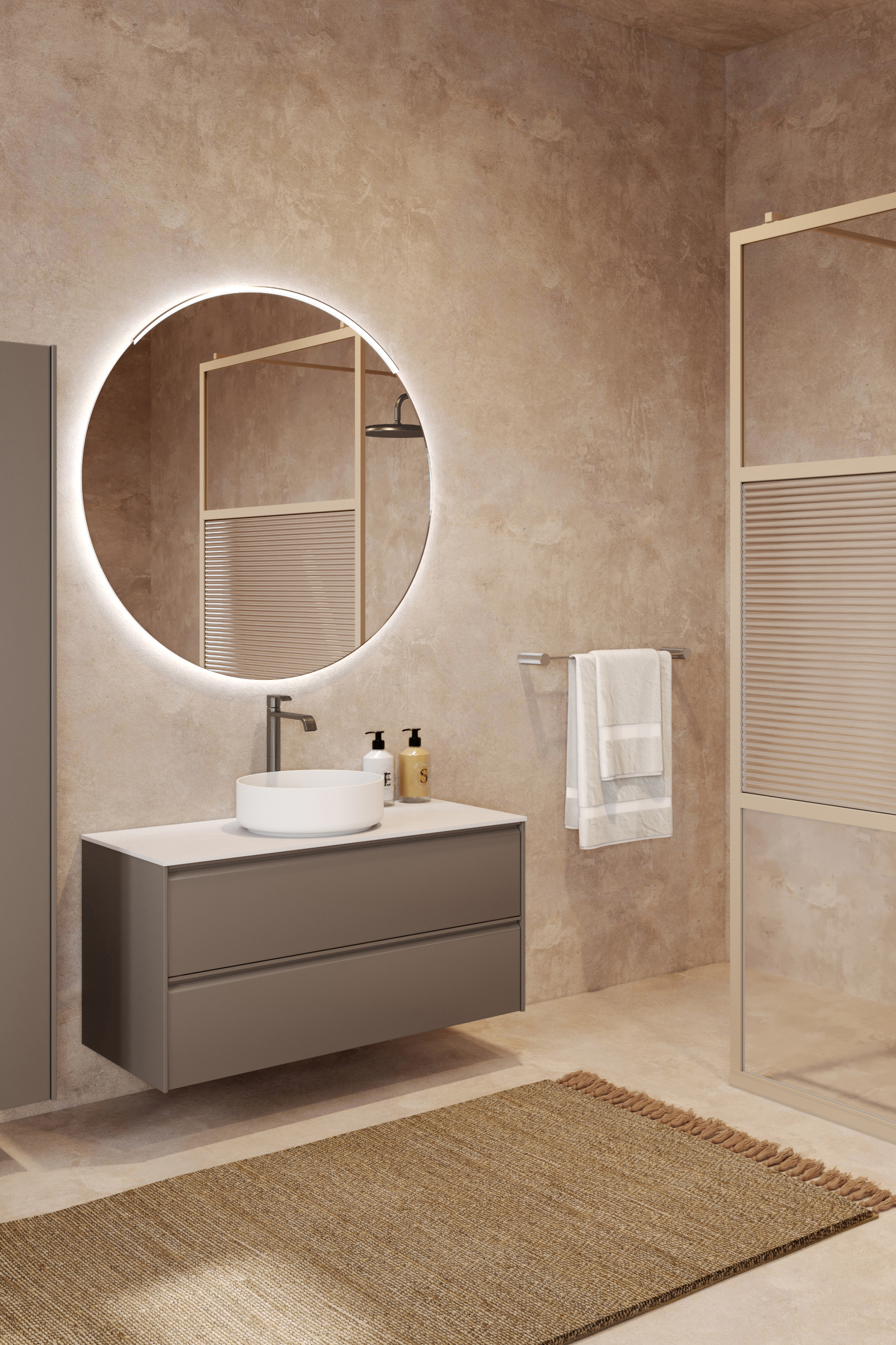 Cabinet color options are matt greige, matt white and matt grey.
