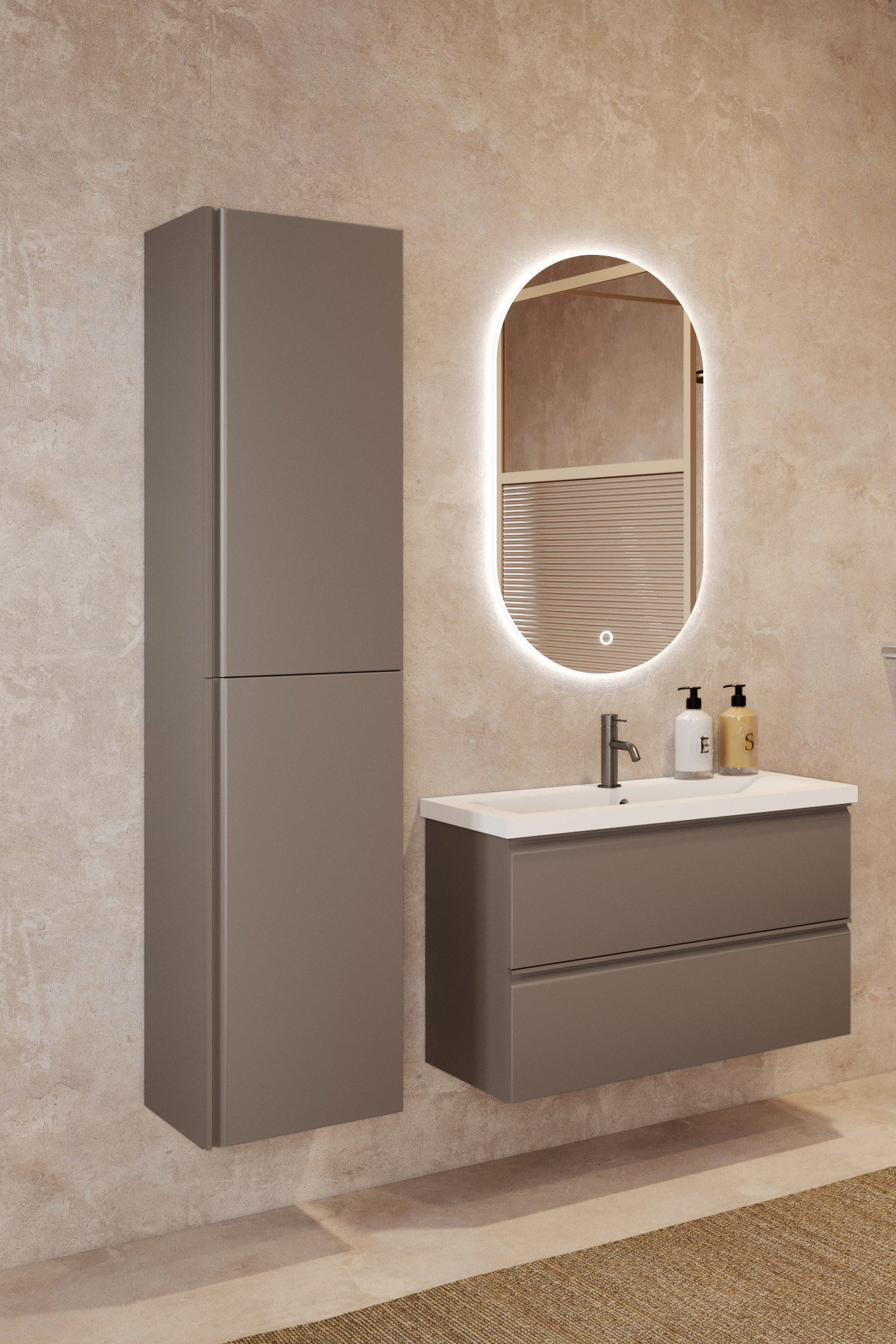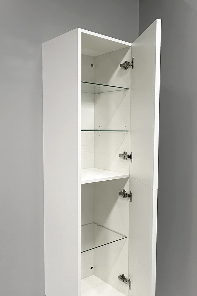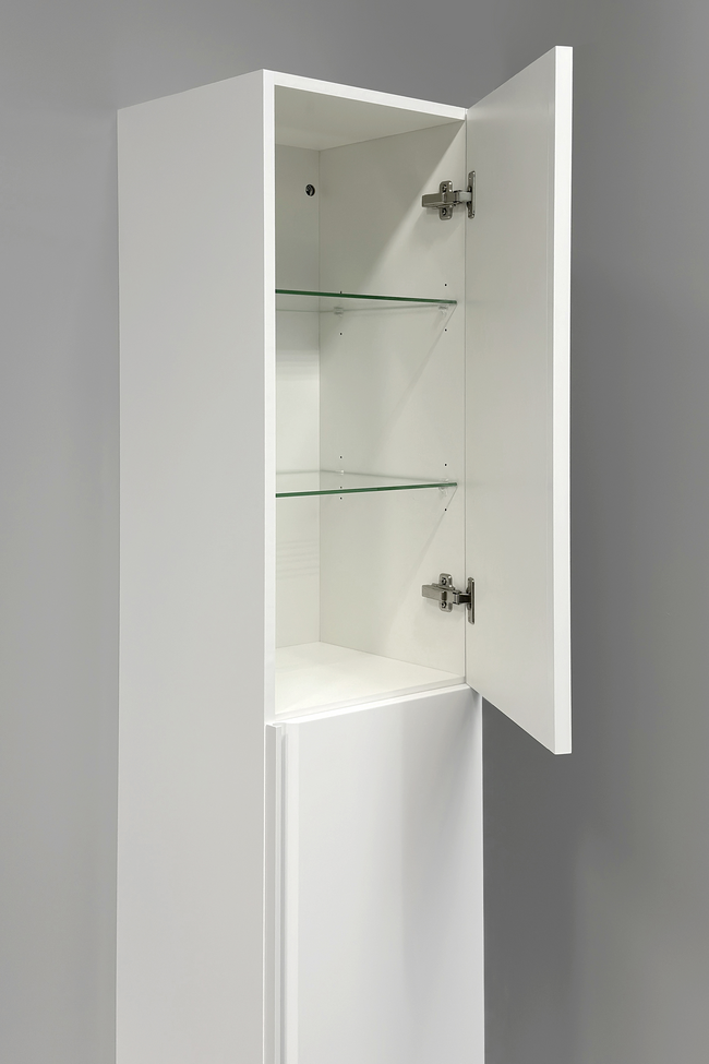 Tall unit bring more storage space to bathroom. Product surface materials are the same as in series vanity units. Tall unit is provided with two doors and and integrated metal handles. Door handedness is selected when the unit is being mounted. Unit has three adjustable glass shelves.
