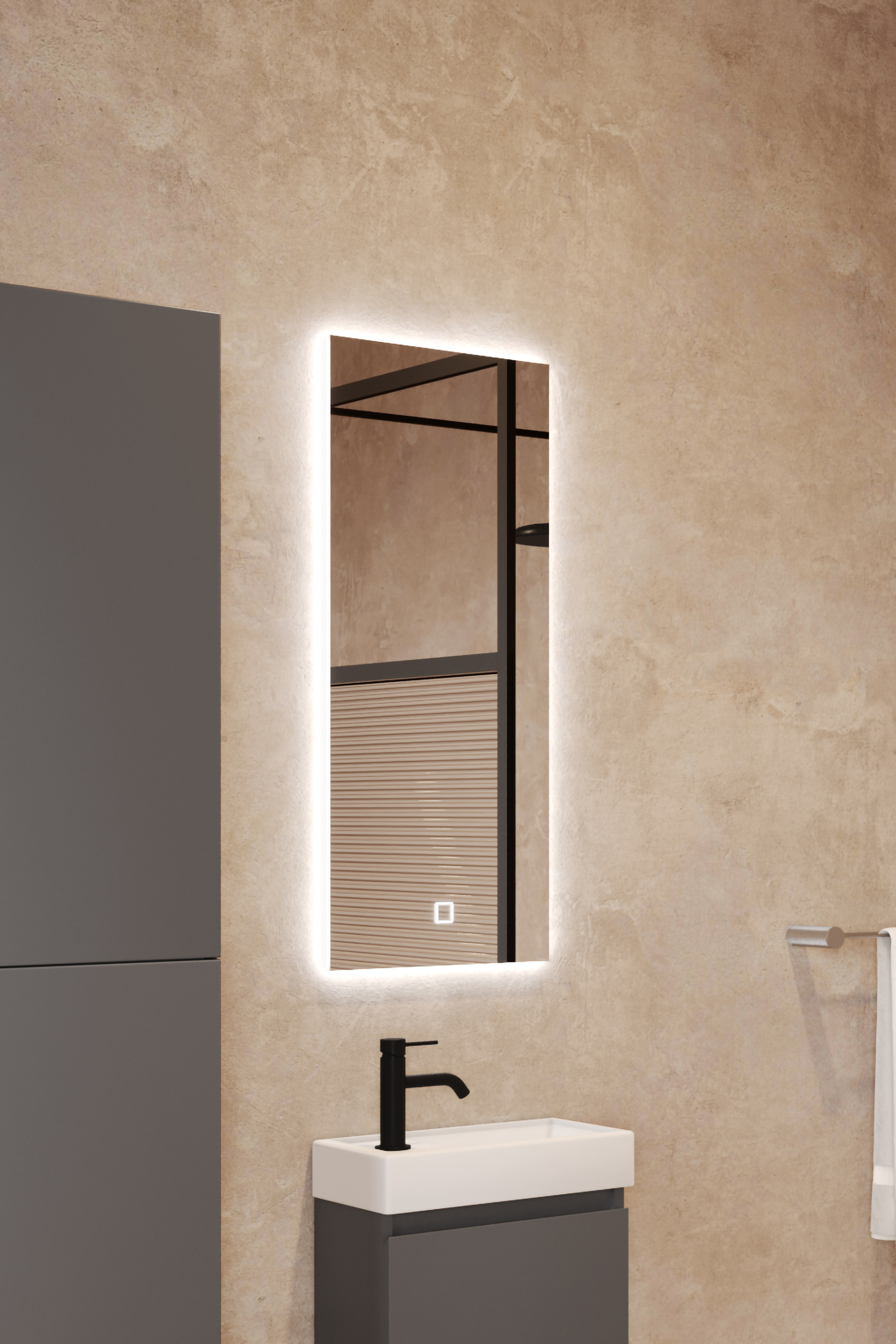 Mirror is mounted with screws on building wall. Installation height can be freely chosen. Mirror electrical components are IP44 compliant. Please note that mirror requires a 230V electric connection connected to rear part of the mirror.