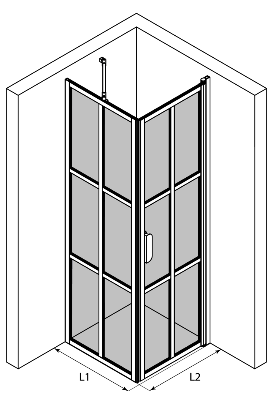 The size of the shower corner can be selected from among the standard sizes or it can be manufactured custom dimensions. The adjustment range of the wall mounted profile of the fixed part is 7mm and that of the door, 15mm, respectively. The adjustment range can be used for levelling of any tilt of the building s walls or for extending the widths of the sides of the shower enclosure in relation to the provided standard dimensions. The widths of one or both sides can be further extended by 34mm(door), 40mmm(fixed panel) via the extension profile (optional accessory). The extension profile can be grooved, for example, for the inlet of the surface water pipes. The fixed panel is mounted with tuning leg by default which is suitable for tilted floors in the case of even floor the floor mounted option can be selected.