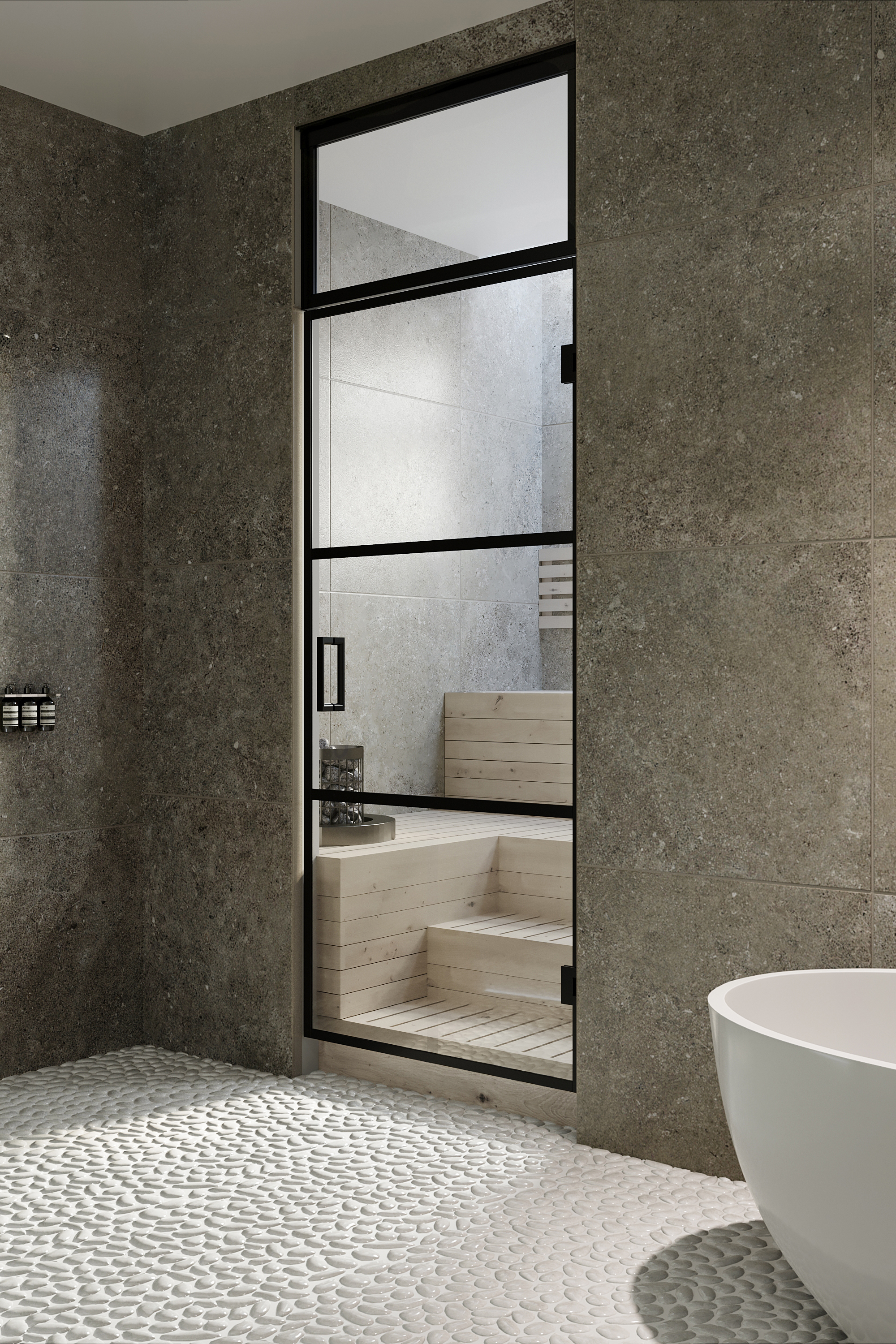 Bläk sarjan saunatuotteet ovat moderniin teollisuushenkiseen tyyliin muotoiltuja.