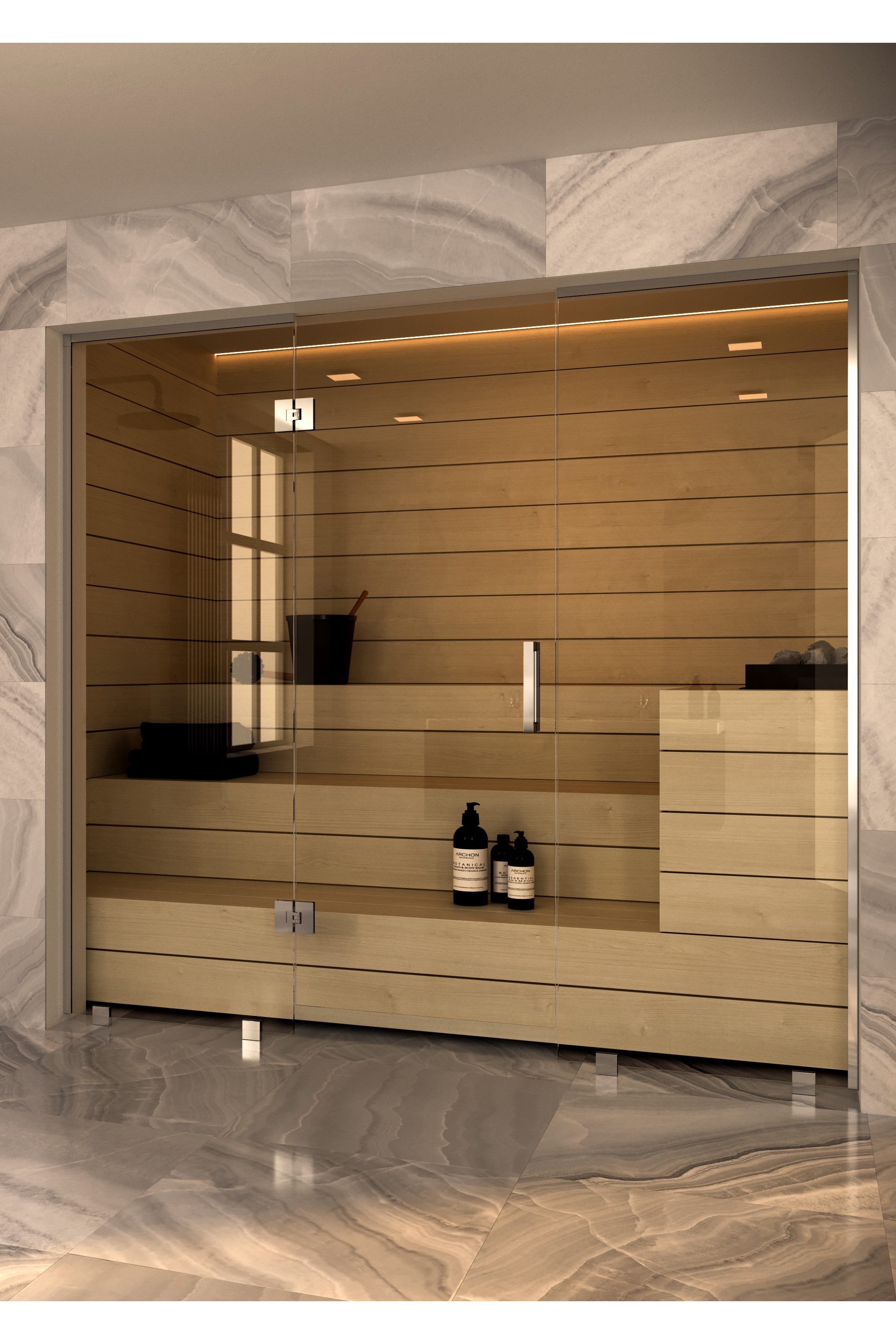 Tuote soveltuu saunatilan jakamiseen. Ovessa ei ole lainkaan karmeja vaan saranat kiinnitetään suoraan saranapuolen sivulasiin. Sivulasit tuovat lisää valoa ja avaruuden tuntua tilaan.