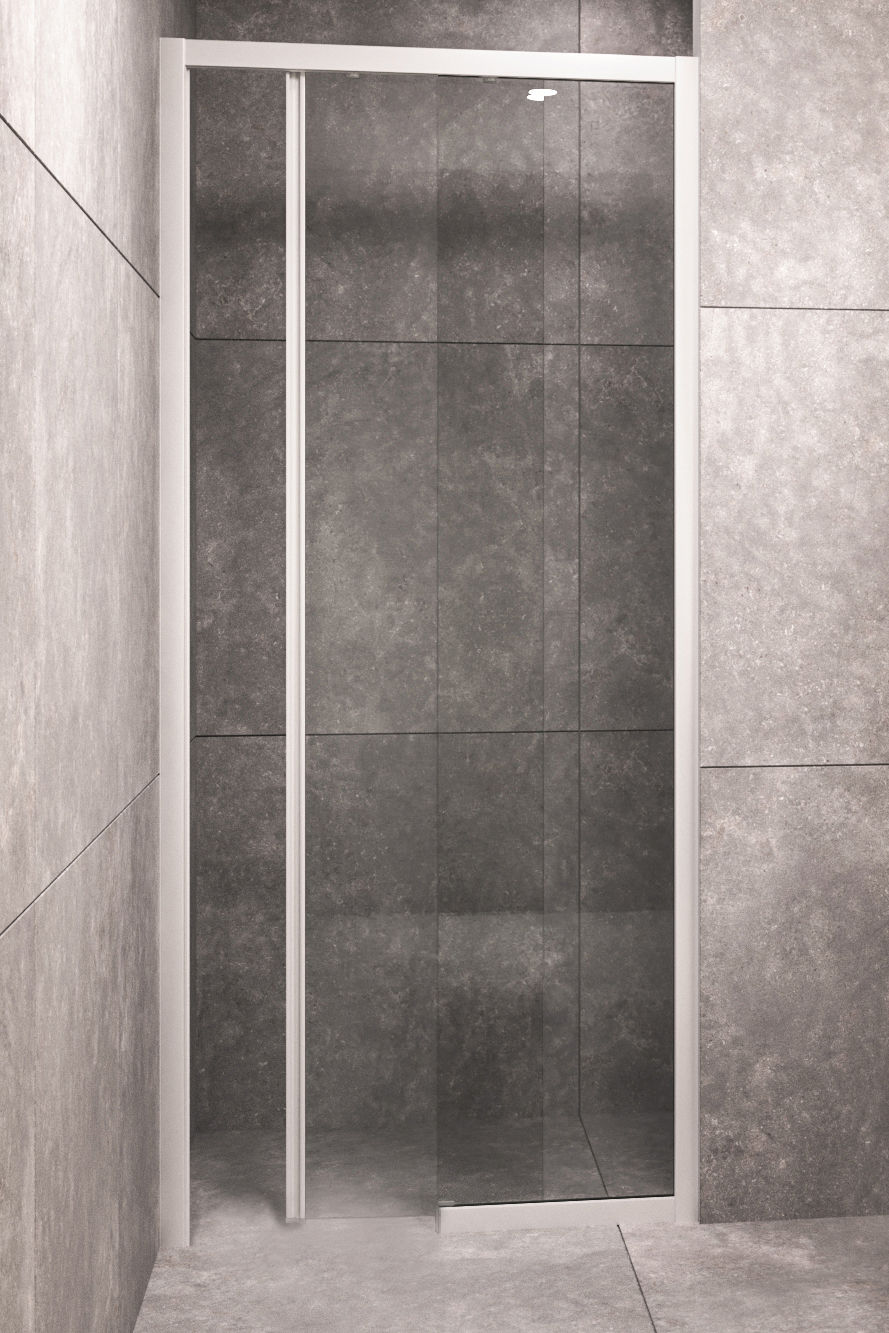 The door slides behind the fixed part supported by the bearing wheels installed into the top edge of the door. The bottom part of the door moves in the guide groove of the lower slide rail. A magnet seal keeps the door tightly closed during showering. The door is equipped with a long profile handle the height of the entire panel.