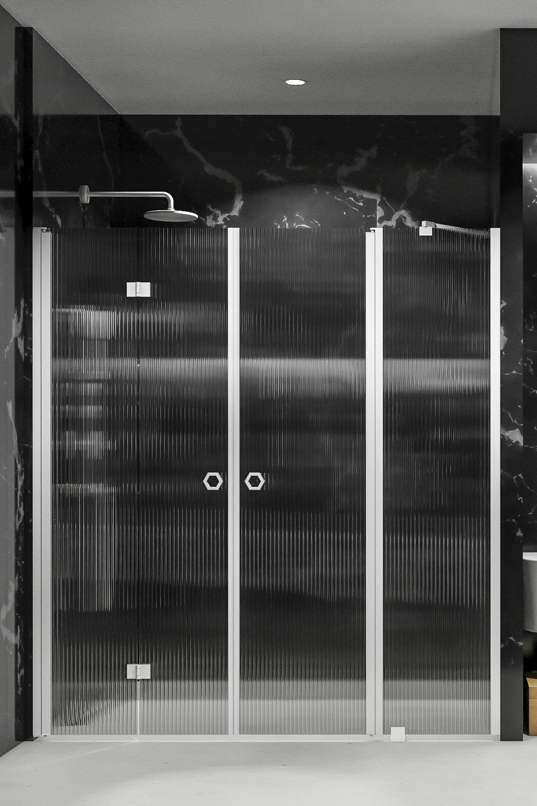 The Alcove fitting configuration consists of a folding door and a fixed wall into which a hinged door has been installed. The product is well-suited for a shower enclosure next to which there are fixtures and where the door may not have enough space to properly open to both sides. A folding door does not require space for opening outside the shower area; instead, the door folds inside the shower area so that the door panels fold into a small space against the wall of the building. A fixed wall and doorway can be dimensioned so that the fixed wall protects the fixtures the doorway occupies the width of the available space. The doors can be dimensioned symmetrically or so that the doors are of different sizes. When the shower is not in use the doors can be positioned parallel to the building walls.Doors rotate 90 degrees in both directions and are equipped with adjustable centrings. The function of the centring is to return the door to the open and closed positions. A pair of magnet seals keeps the doors tightly closed during showering.
