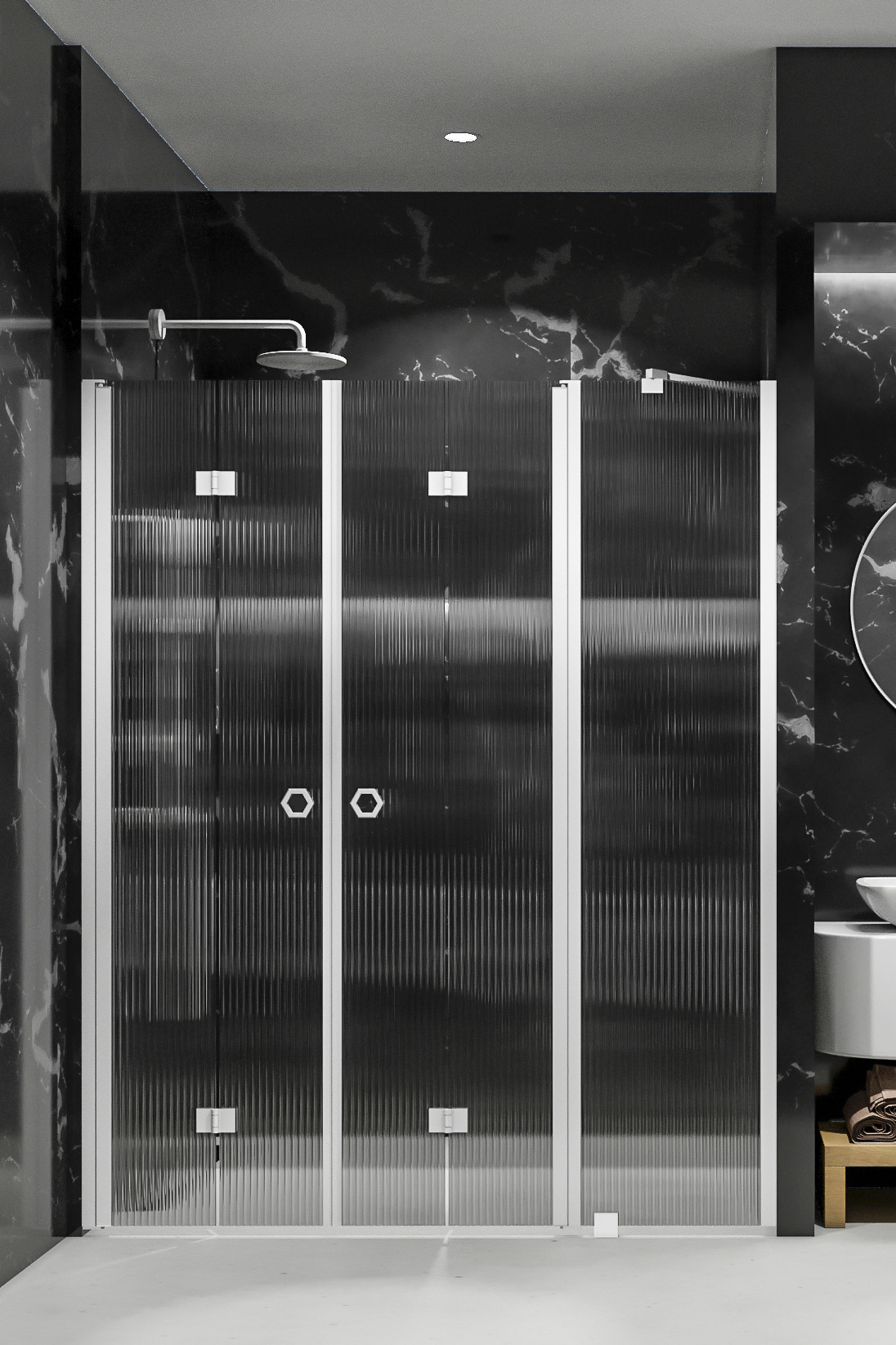 The Alcove fitting configuration consists of a folding door and a fixed wall into which a hinged folding door. The product is well-suited for a shower enclosure a shower enclosure where doors may not have the space to properly open outwards and on the other side of which the space is cramped also on the inside of the shower area. Folding door does not require space for opening from outside the shower area but instead folds into the small space inside the shower area in the direction of the building wall. Fixed wall can be dimensioned according to the fixtures (e.g. the mixer) inside the shower area so that the door does not hit the fixtures when being folded. Doors can be dimensioned symmetrically or so that the doors are of different sizes. When the shower is not in use, the door can be turned in the direction of the building walls. Doors rotate 90 degrees in both directions and are equipped with adjustable centrings. The function of the centring is to return the door to the open and closed position. A pair of magnet seals keeps the doors tightly closed during showering.