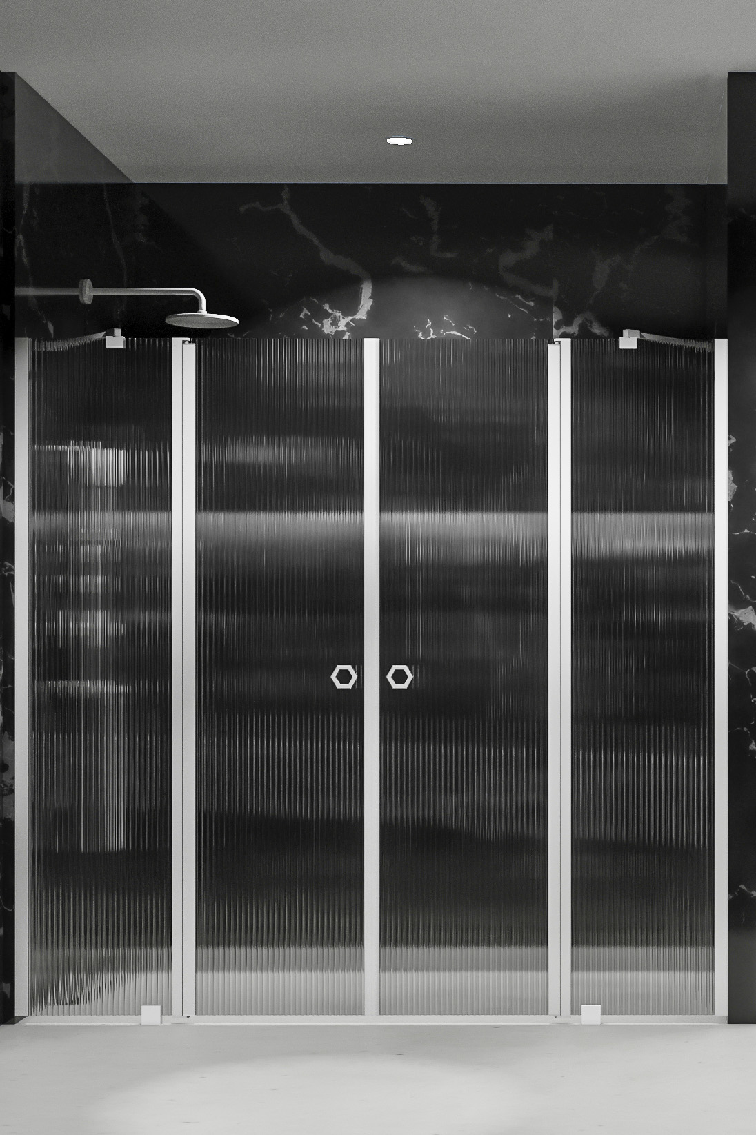 Alcove fitting configuration consists of two fixed walls which are attached to hinged doors. The product is well-suited for a shower enclosure that has fixtures on both sides. The fixed parts can be dimensioned according to the depth of the fixtures so that when opened, the doors do not hit the fixtures. Doors can be dimensioned symmetrically or so that the doors are of different sizes. When the shower is not in use, the door can be turned in the direction of the building walls. Doors rotate 90 degrees in both directions and are equipped with adjustable centrings. The function of the centring is to return the door to the open and closed positions. positions. A pair of magnet seals keeps the doors tightly closed during showering.
