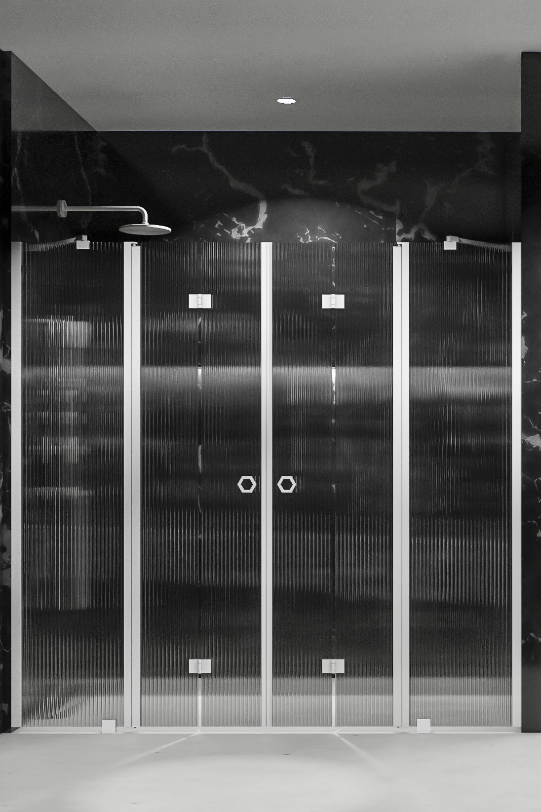 Alcove fitting configuration consists of two fixed walls, into whichdouble folding doors have been hinged. The product is well-suited for a shower enclosure where the doors do not necessarily have the space to properly open outwards and where the space is cramped also in the inside of the shower area. A folding door does not require space for opening outside the shower area; instead, the door folds inside the shower area so that the door panels fold into a small space in the direction of the wall of the building. Fixed wall can be dimensioned according to the fixture (e.g. the mixer) inside the shower area so that the doors do not hit the fixtures when being folded. The doors can be dimensioned symmetrically or so that the doors are of different sizes. When the shower is not in use, the doors can be turned in the direction of the building walls. Doors rotate 90 degrees in both directions and are equipped with adjustable centrings. The function of the centring is to return the door to the open or closed position. A pair of magnet seals keeps the doors tightly closed during showering.