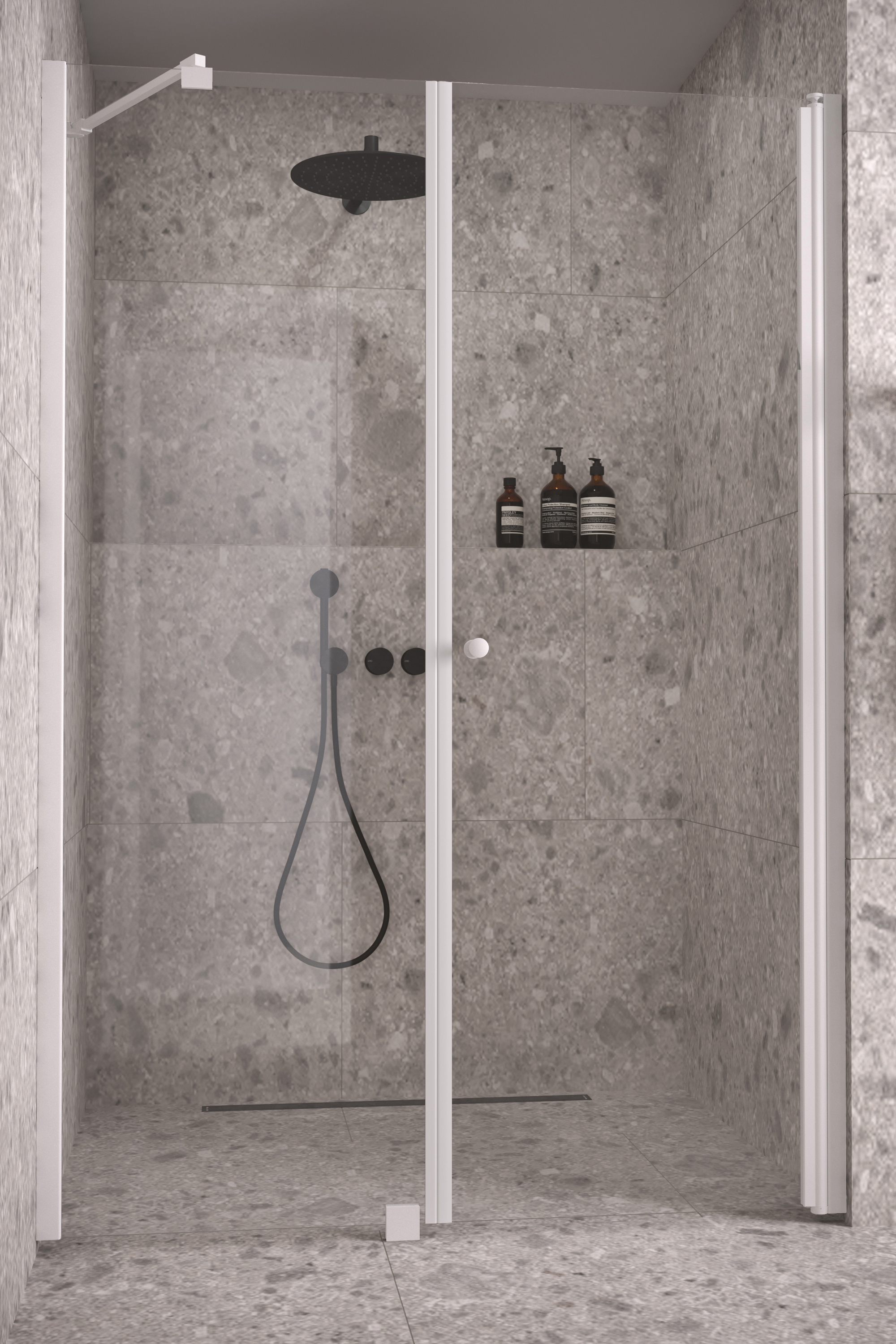 Alcove fixture with a door consists of a fixed wall and a hinged door. The product is well-suited for a shower enclosure with fixtures located next to it. The fixed wall and door can be dimensioned so that the fixed wall protects the fixtures and the door is of the width of the available space.The door opens 90 degrees to the outside and is equipped with an adjustable centring. The centring tries to return the door back to the open and closed positions. A magnet seal keeps the door tightly closed during showering.