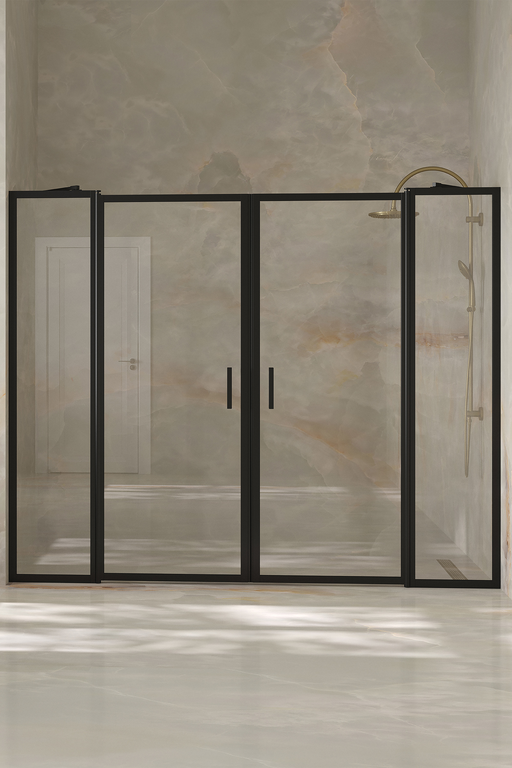 Doors rotate 90 degrees in both directionsand are equipped with adjustable centring. The centring attempts to return the door back to the open and closed positions. A magnet seal keeps the door tightly closed during showering.