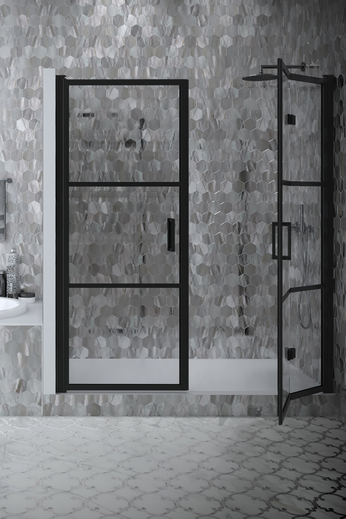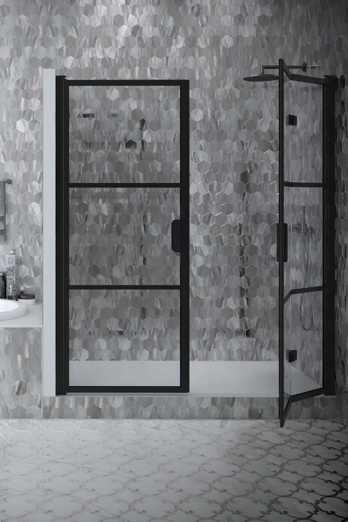 Doors rotate 90 degrees in both directions and are equipped with adjustable centrings. The function of the centring is to return the door to the open and closed positions. positions. In addition, the outer panel of the folding door rotates 180 degrees in relation to the inner panel so that the panels fold against each other into the interior portion of the shower area. A pair of magnet handles keeps the doors tightly closed during showering.
