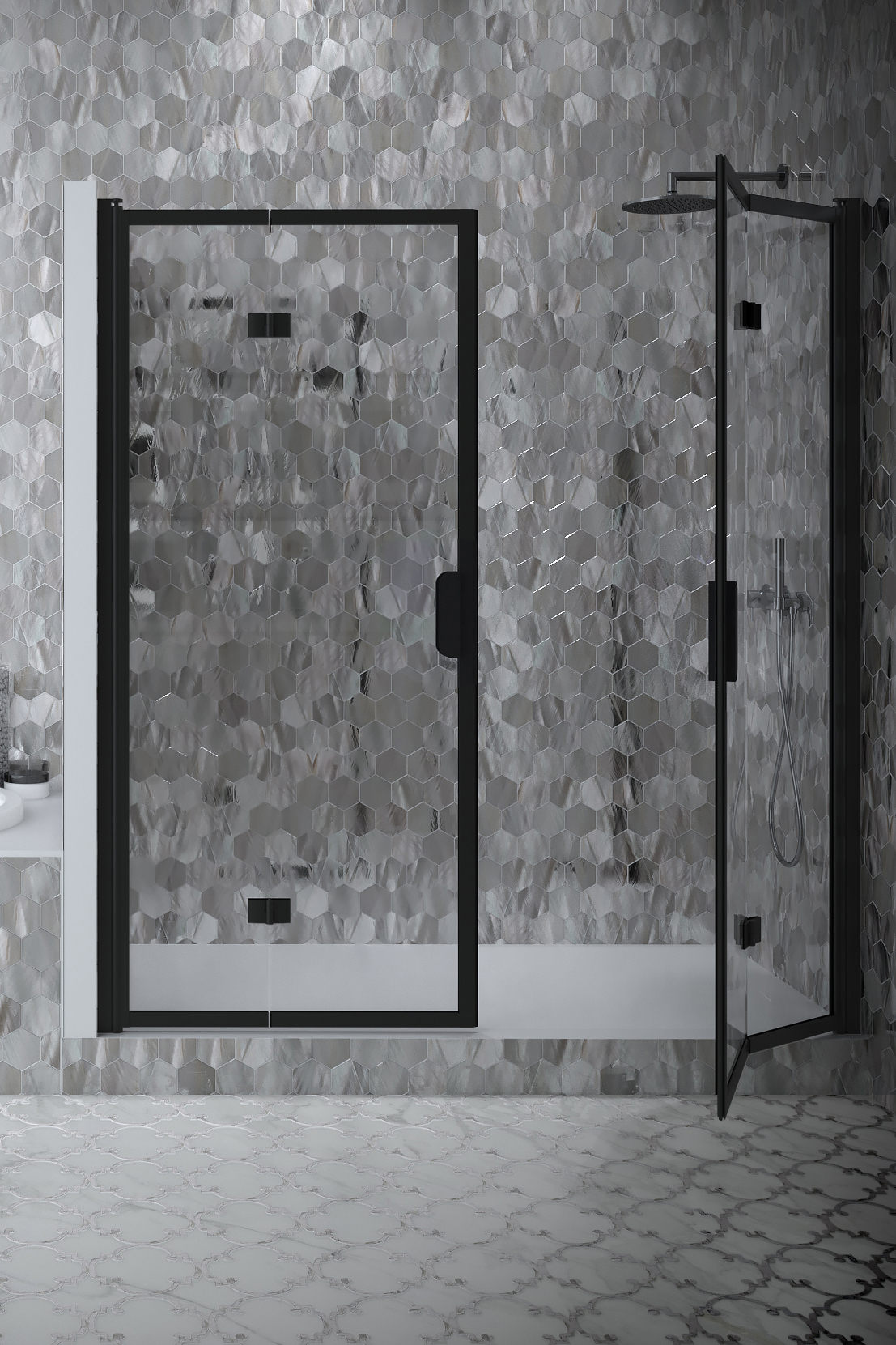 Doors rotate 90 degrees in both directions and are equipped with adjustable centrings. The function of the centring is to return the door to the open and closed positions. positions. In addition, the outermost panels turn in relation to the innermost panels so that the panels of the doors fold against each other to the internal side of the shower area. A pair of magnet handles keeps the doors tightly closed during showering.