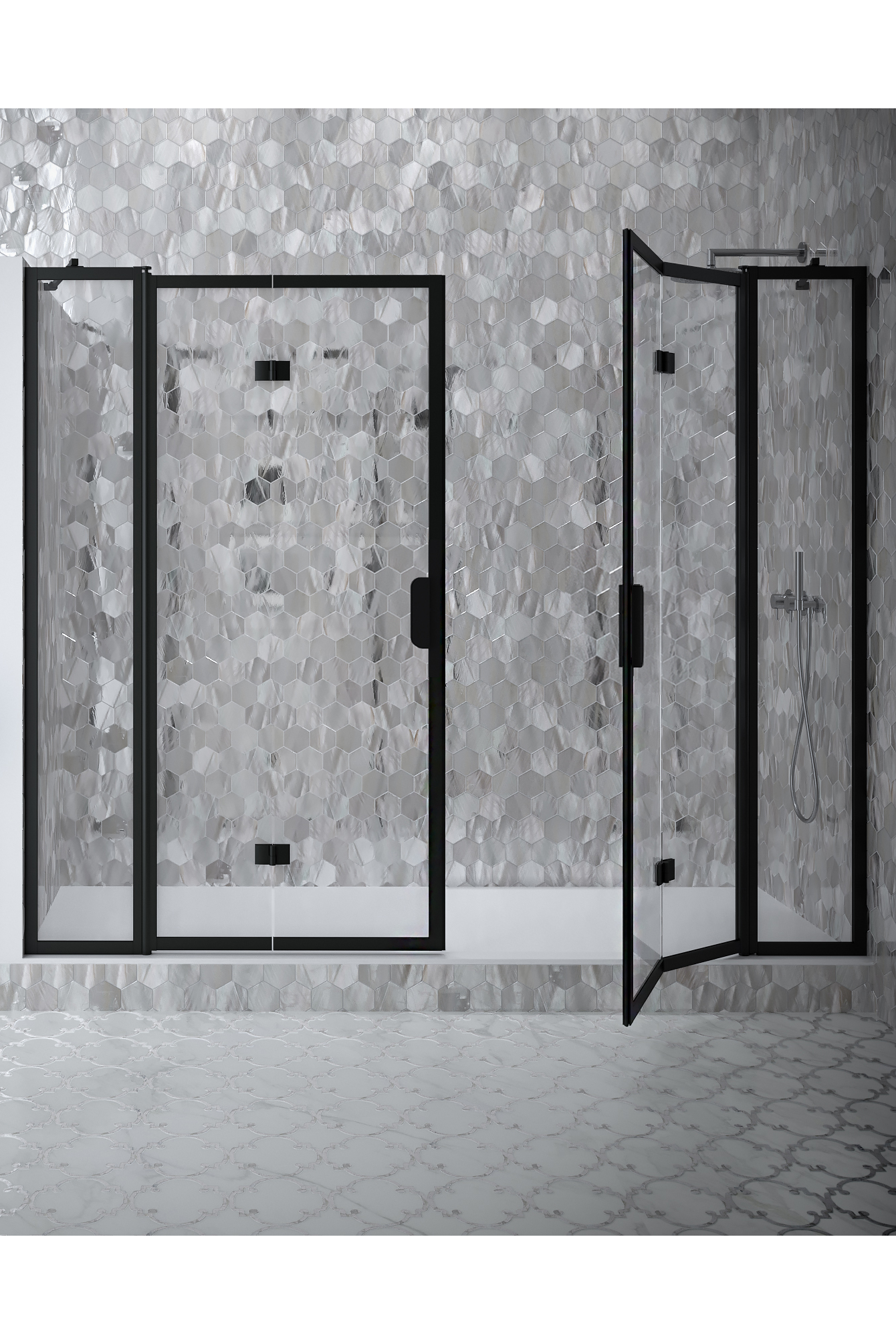 Doors rotate 90 degrees in both directions and are equipped with adjustable centrings. The function of the centring is to return the door to the open and closed positions. positions. In addition, the outermost panels turn in relation to the innermost panels so that the panels of the doors fold against each other to the internal side of the shower area. A pair of magnet handles keeps the doors tightly closed during showering.