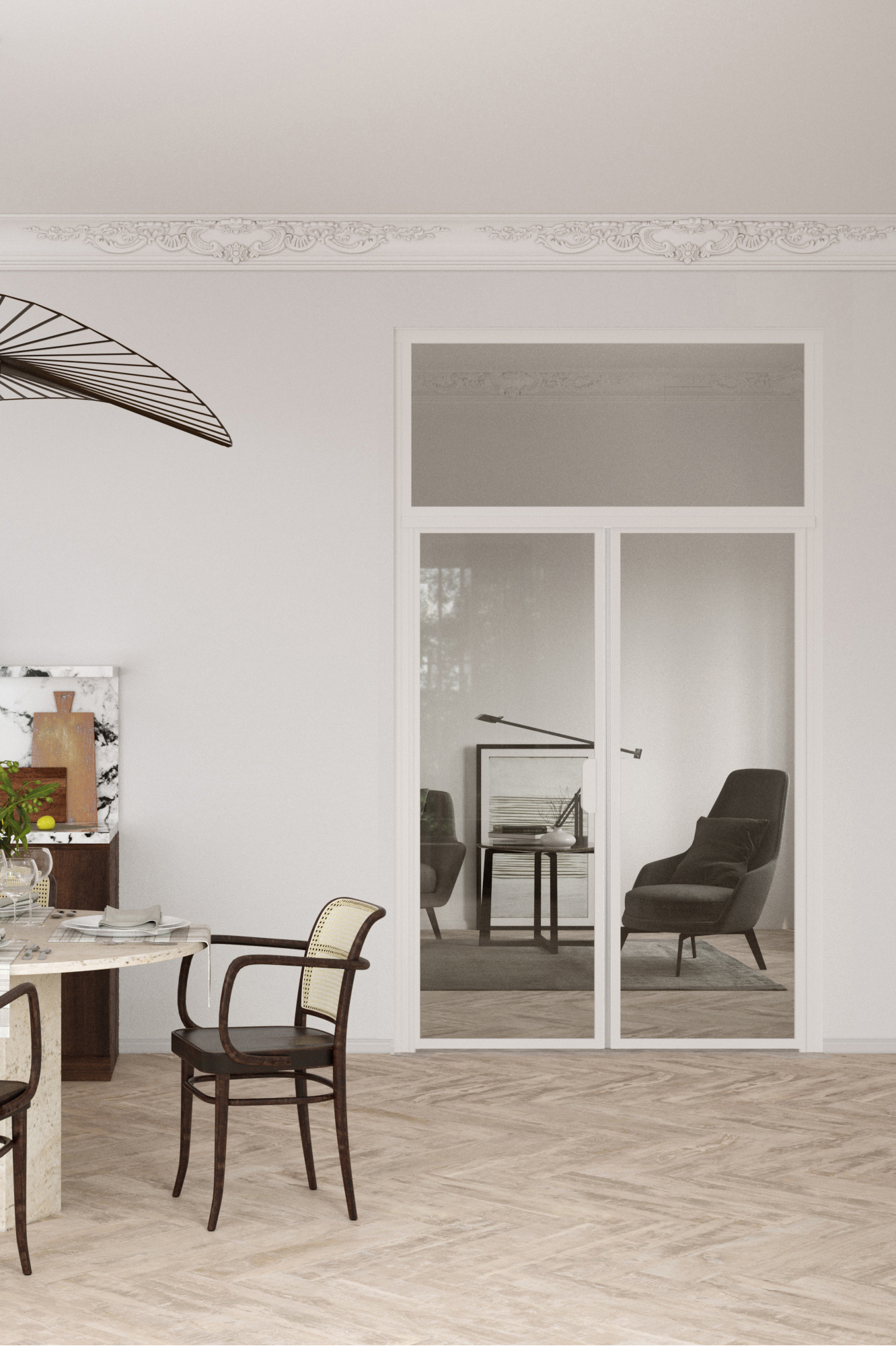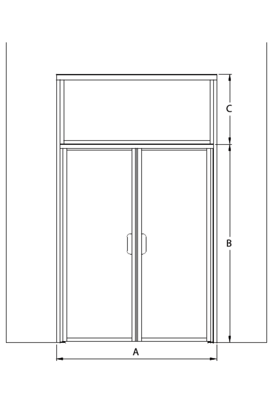 The door panels are mounted to building wall using wall mounting profiles on each side of the enclosure space. The panels and the upper window are secured with self-drilling screws. The top of the unit is secured to the ceiling by long profiles, covering the top of the unit and by a short profile, covering bottom window edge from one side(both sides). Magnet seals are installed on each of the doorway panels to keep the door tightly closed.