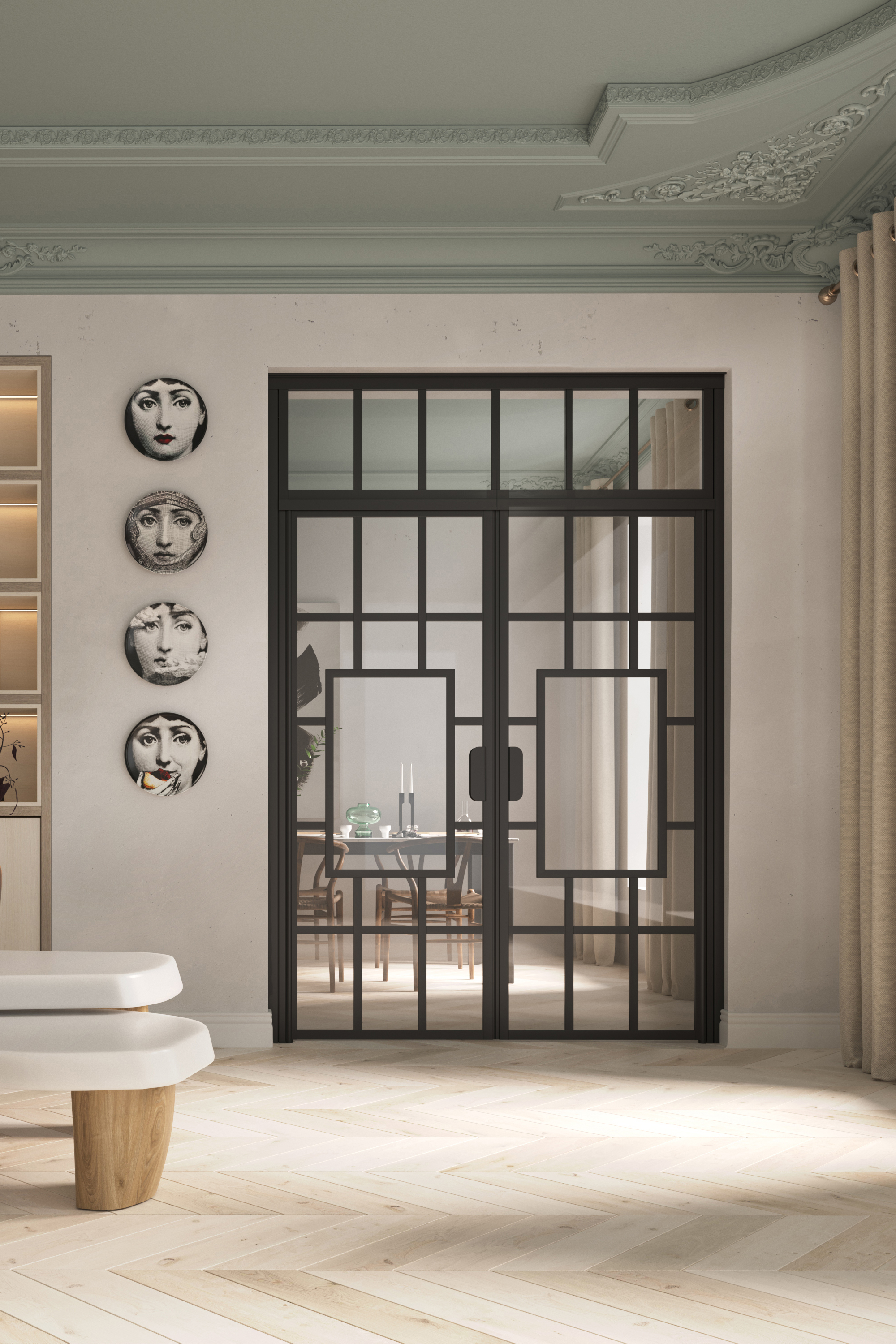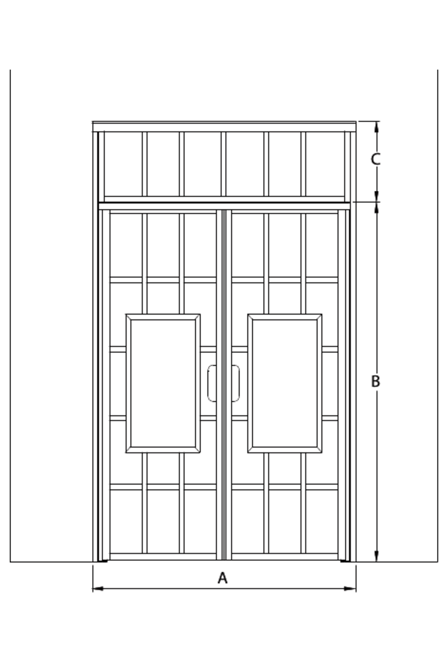 The door panels are mounted to building wall using wall mounting profiles on each side of the enclosure space. The panels and the upper window are secured with self-drilling screws. The top of the unit is secured to the ceiling by long profiles, covering the top of the unit and by a short profile, covering bottom window edge from one side(both sides). Magnet seals are installed on each of the doorway panels to keep the door tightly closed.