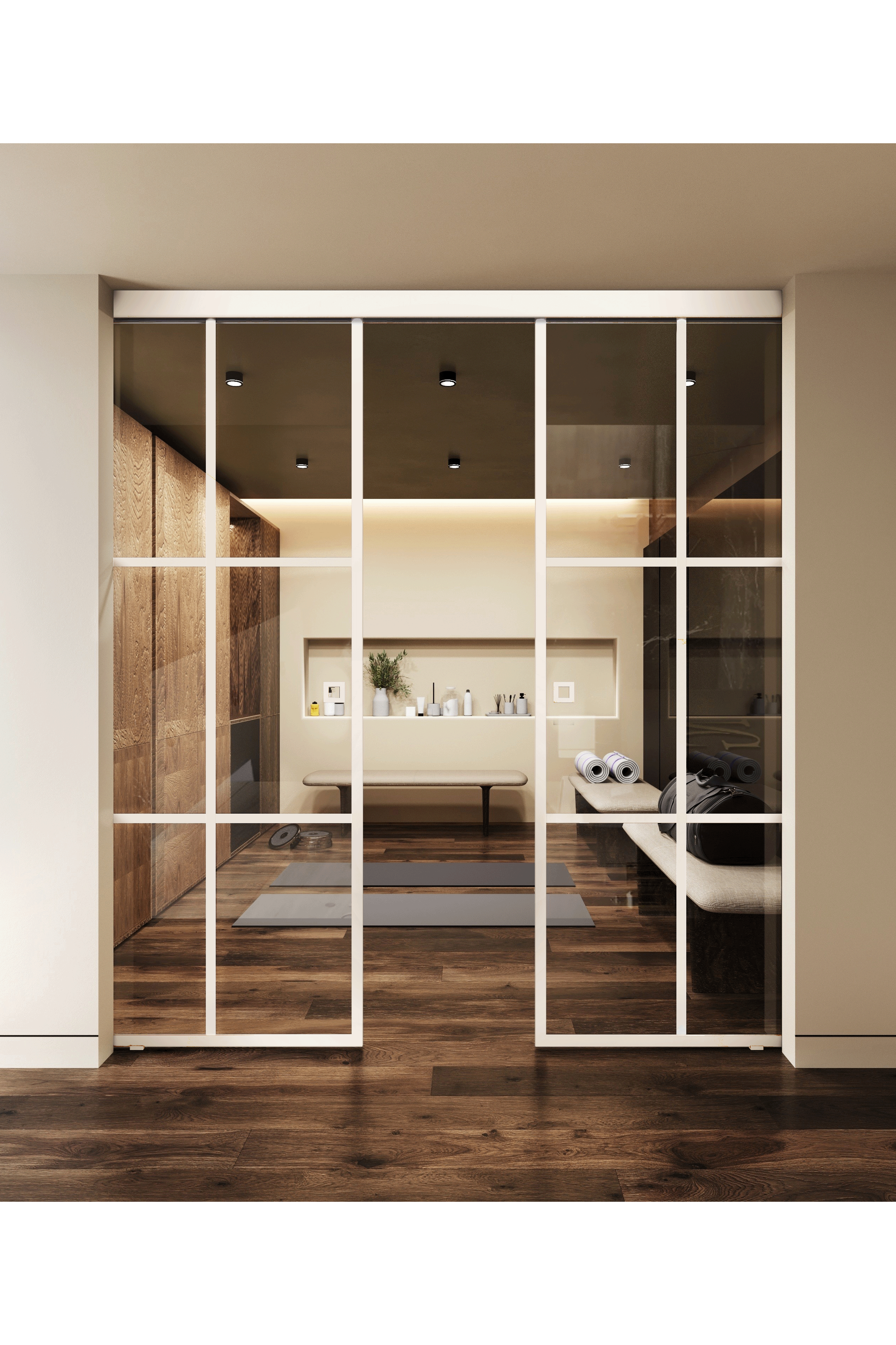 The sliding double door glass wall consists of two sliding door panels and a sliding mechanism mounted to the building wall above the doorway. Sliding door fixture takes up very little space in the room, a quality sliding mechanism and a floor guide fitting provides a smooth and safe door movement. The doors are equipped with soft closing mechanism which cushions the closing and gently pulls the door into position.