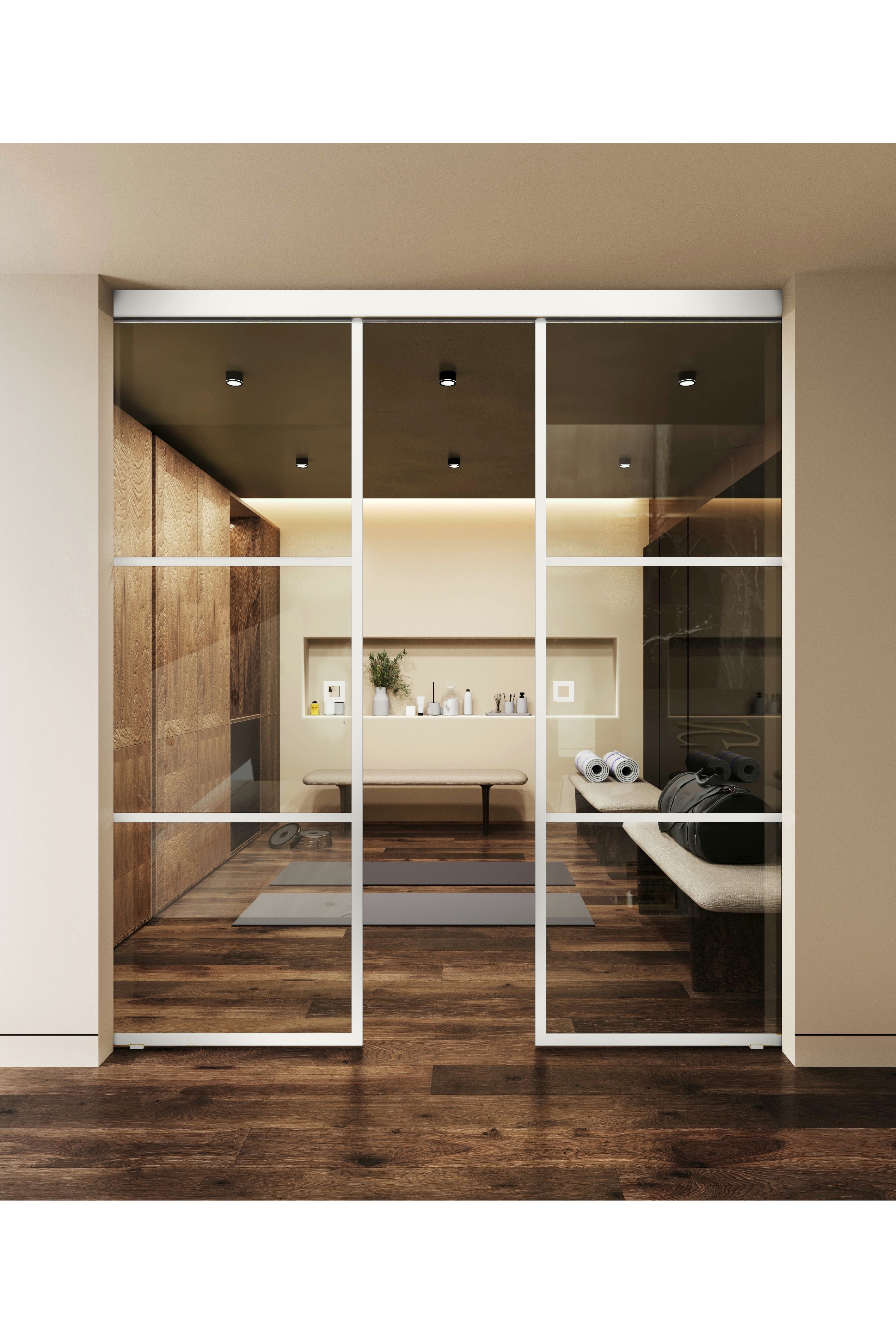 The sliding double door glass wall consists of two sliding door panels and ceiling mounted sliding mechanisms. Sliding door fixture takes up very little space in the room, a quality sliding mechanism and a floor guide fitting provides a smooth and safe door movement. The doors are equipped with soft closing mechanism which cushions the closing and gently pulls the door into position.