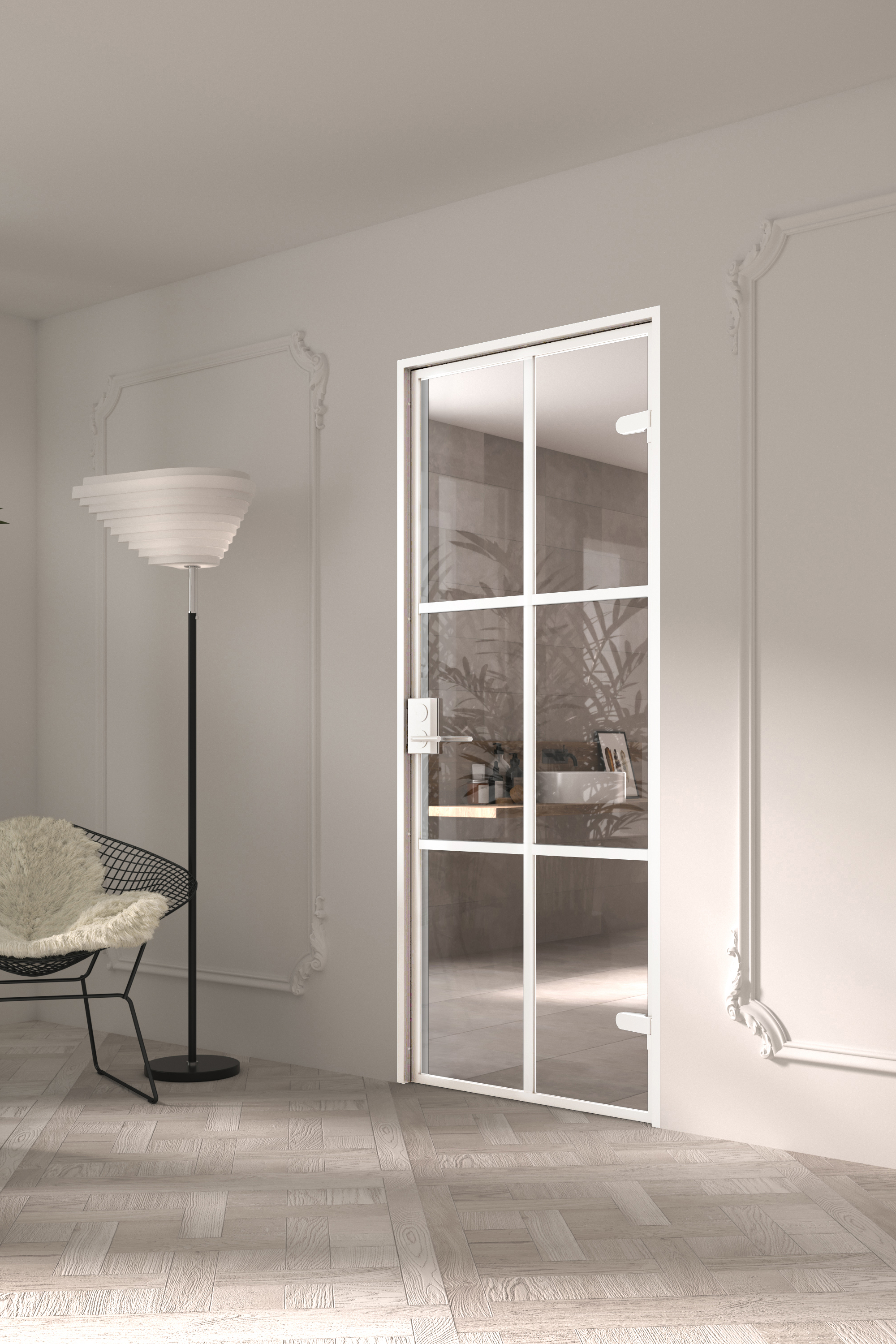 In the Helsinki model, the door leaf is unframed, so the edges of the door leaf are exposed glass. In the New York, Tokyo and Paris models, the door leaf is framed. The Tokyo and Paris models are also equipped with aluminum grids glued to the glass.