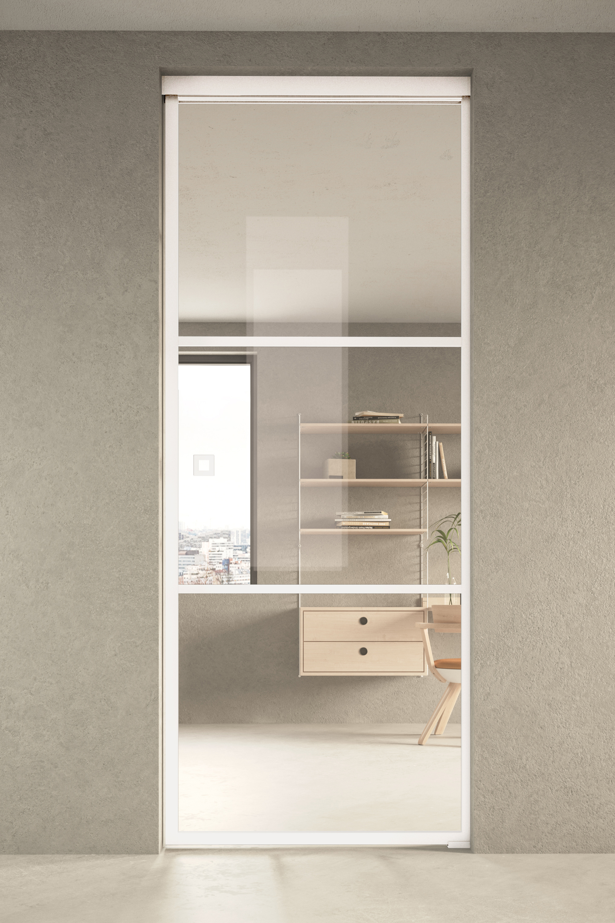The pocket door consists of a sliding glass door and sliding- and maintenance rails mounted to the top of the gap, to the ceiling. The door slides inside the wall on the rail which continues into the wall fixture. A high quality sliding mechanism, as well as a floor guide fitting provides a smooth and safe door movement. The door is equipped with one soft closing mechanism which cushions the closing and gently pulls the door into it's closed position.