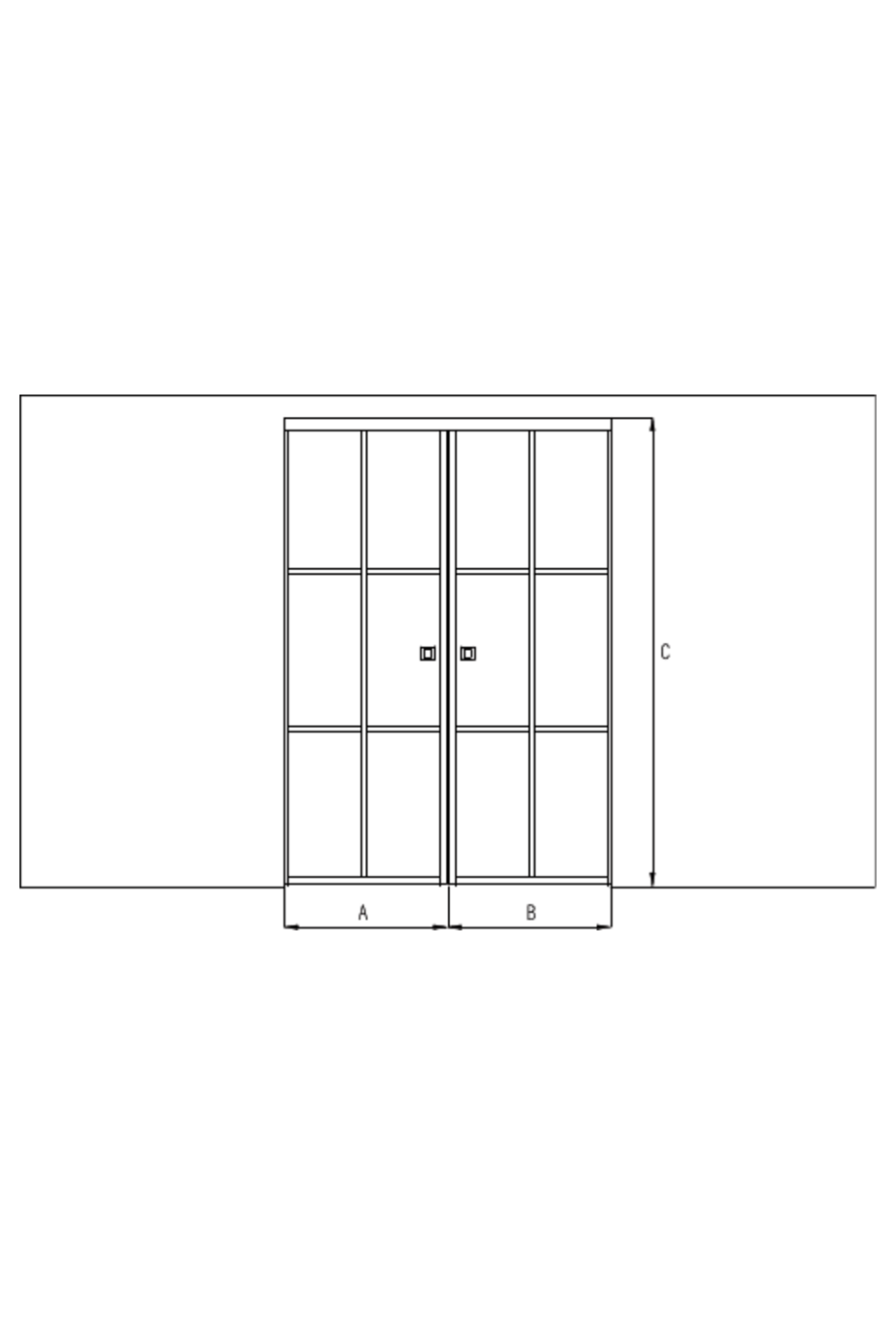 Pocket doors are always manufactured according to custom dimensions. When ordering, enter the actual width of door gap (A+B) and actual height of door gap. The mounting rails will require 48 mm space above the actual gap, inside the wall. Please note that both doors will be approximately 160 mm in the gap when opened, due to the handle needing to be reachable. The mounting rails will always require at least 4000 mm width, including the doorway and the parts inside the walls, if the rails aren't cut during mounting (possible, if doors are less than 950 mm).