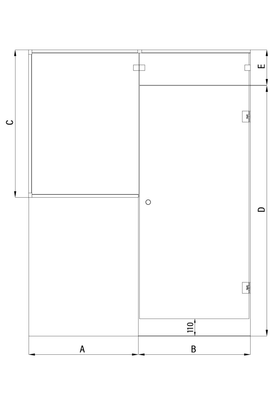 The size of the shower door can be selected from the standard dimensions (700/800/900 x 2000) or it can be manufactured by special dimensions; the upper and the side panels are always manufactured by special dimensions. When selecting the size of the door and the upper panel, the width is the width of the installation opening and the height is the height of the panel pane. When dimensioning the height of the installation opening of the door, a 5mm reserve is automatically left at the top edge of the panel and a 110mm reserve is left at the bottom edge. When selecting the side panels, the width and the height are the width and the height of the installation opening. Installation and adjustment ranges are included automatically in the dimensioning of the panel panes of the side panels.If the size of the door exceeds 1.7m2 an additional hinge is necessary to provide additional support.