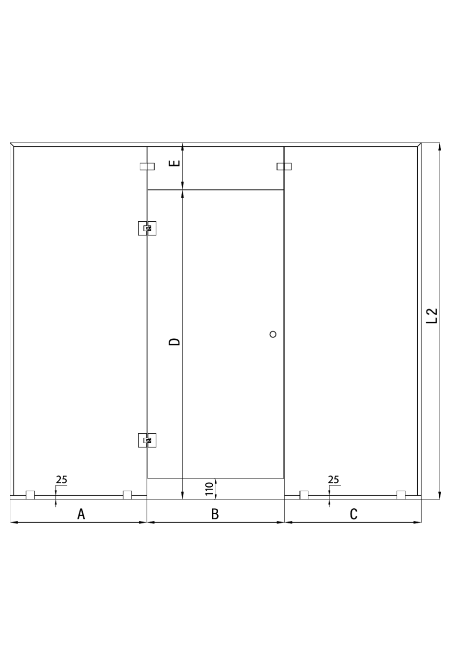 All glassses are always manufactured by special dimensions. When selecting the size of the door, the width and height are those of the installation opening. When dimensioning the height of the installation opening of the door, a 5mm reserve is automatically left at the top edge of the panel and a 110mm reserve is left at the bottom edge. Also when selecting the side panels and the upper glass, the width and the height are the width and the height of the installation opening. The installation and adjustment ranges are included automatically in the dimensioning of the panel panes.If the size of the door exceeds 1.7m2 an additional hinge is necessary to provide additional support.