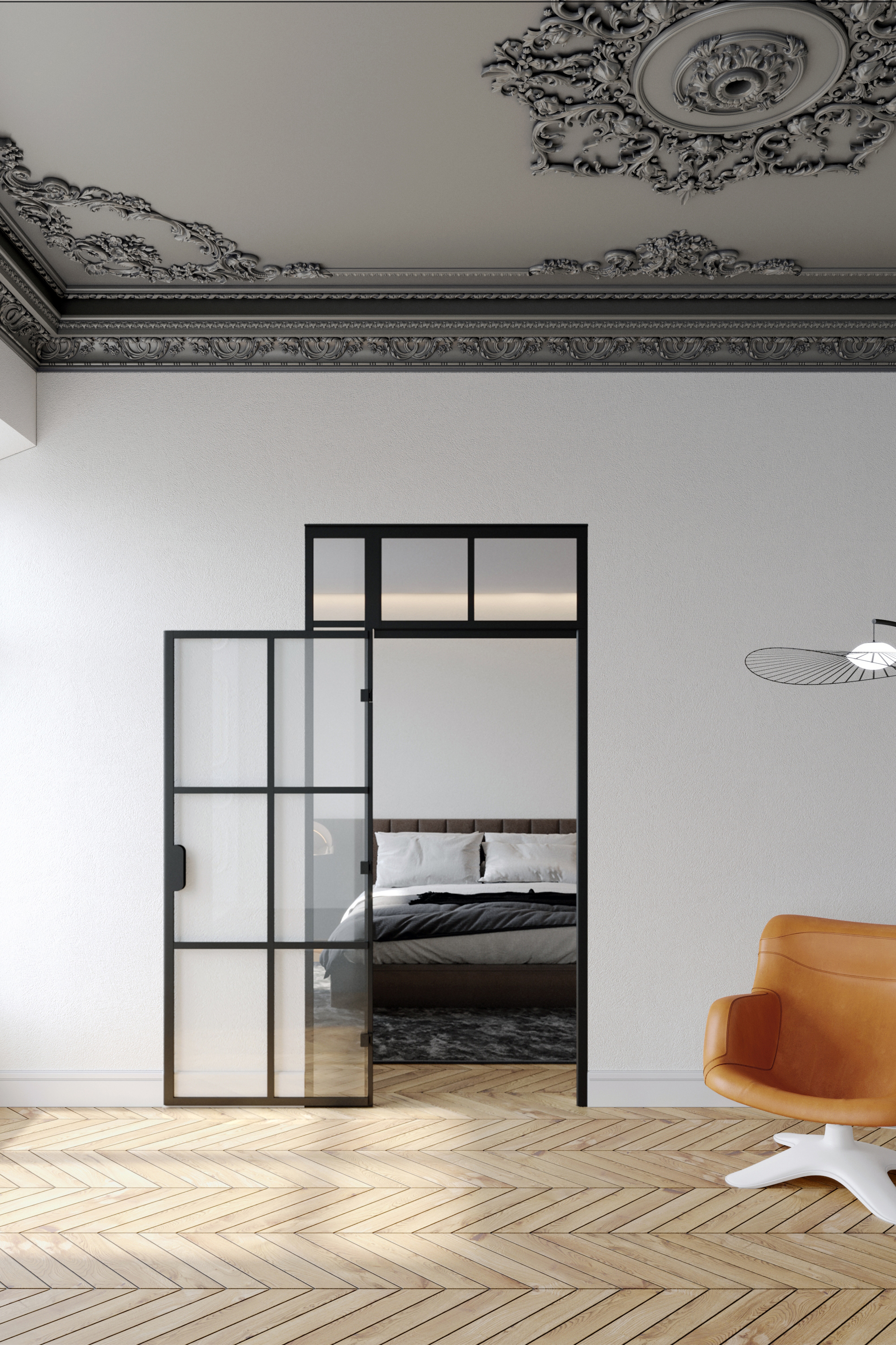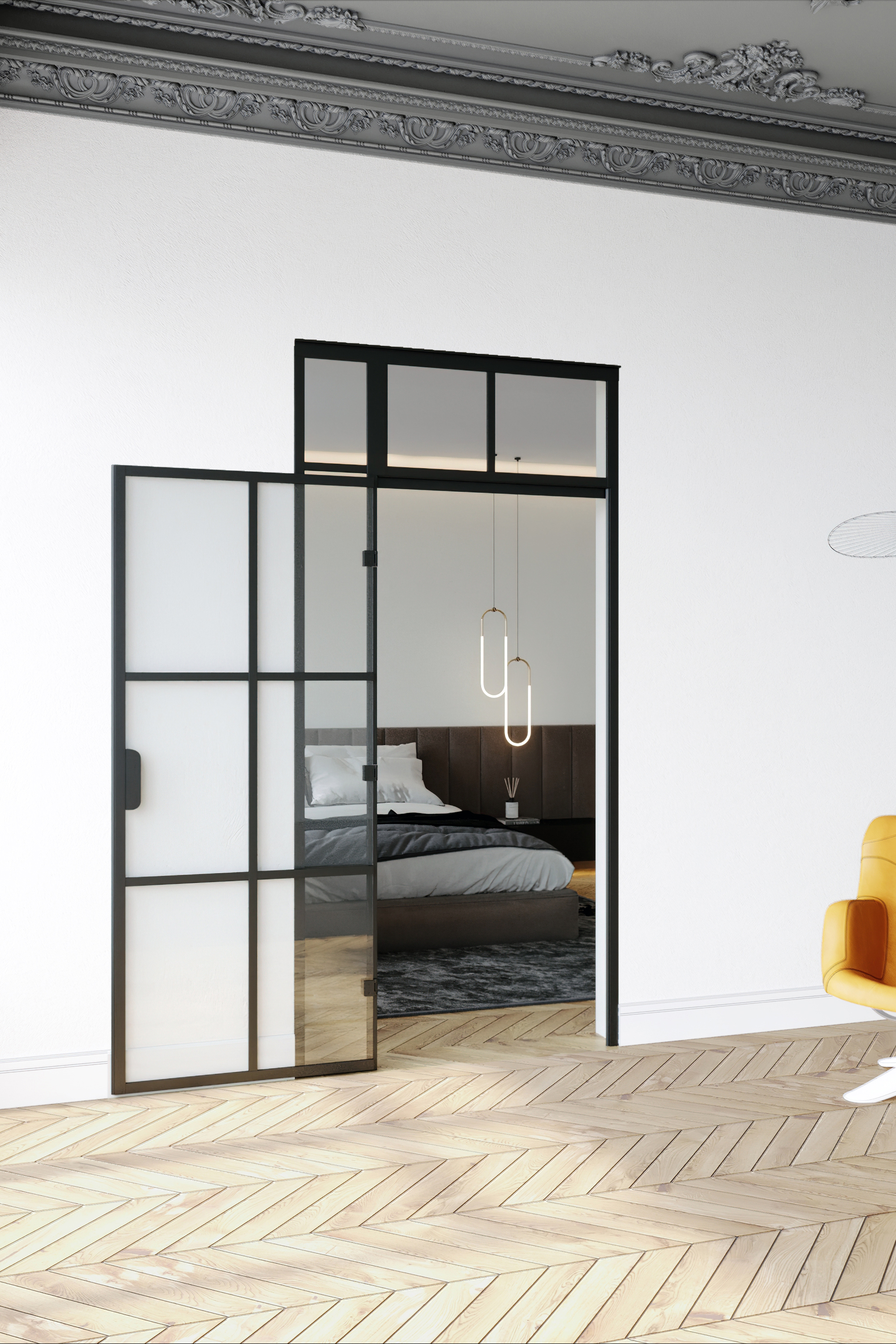 The glass wall configuration consists of an upper window and a fixed panel with a hinged door that opens 180 degrees to the outside.