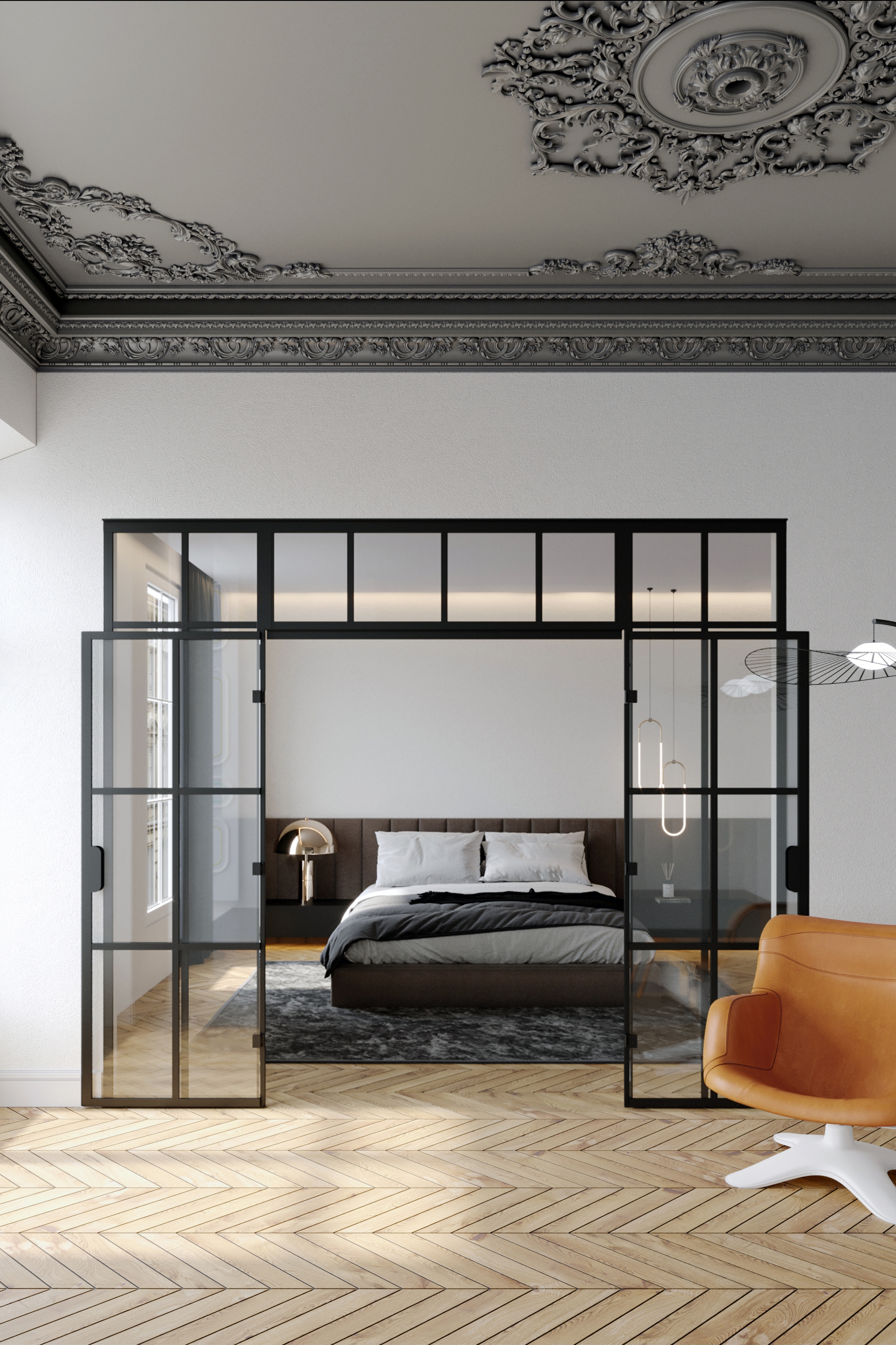 The glass wall configuration consists of two fixed walls with hinged doors and an upper window. Doors open 180 degrees to the outside.