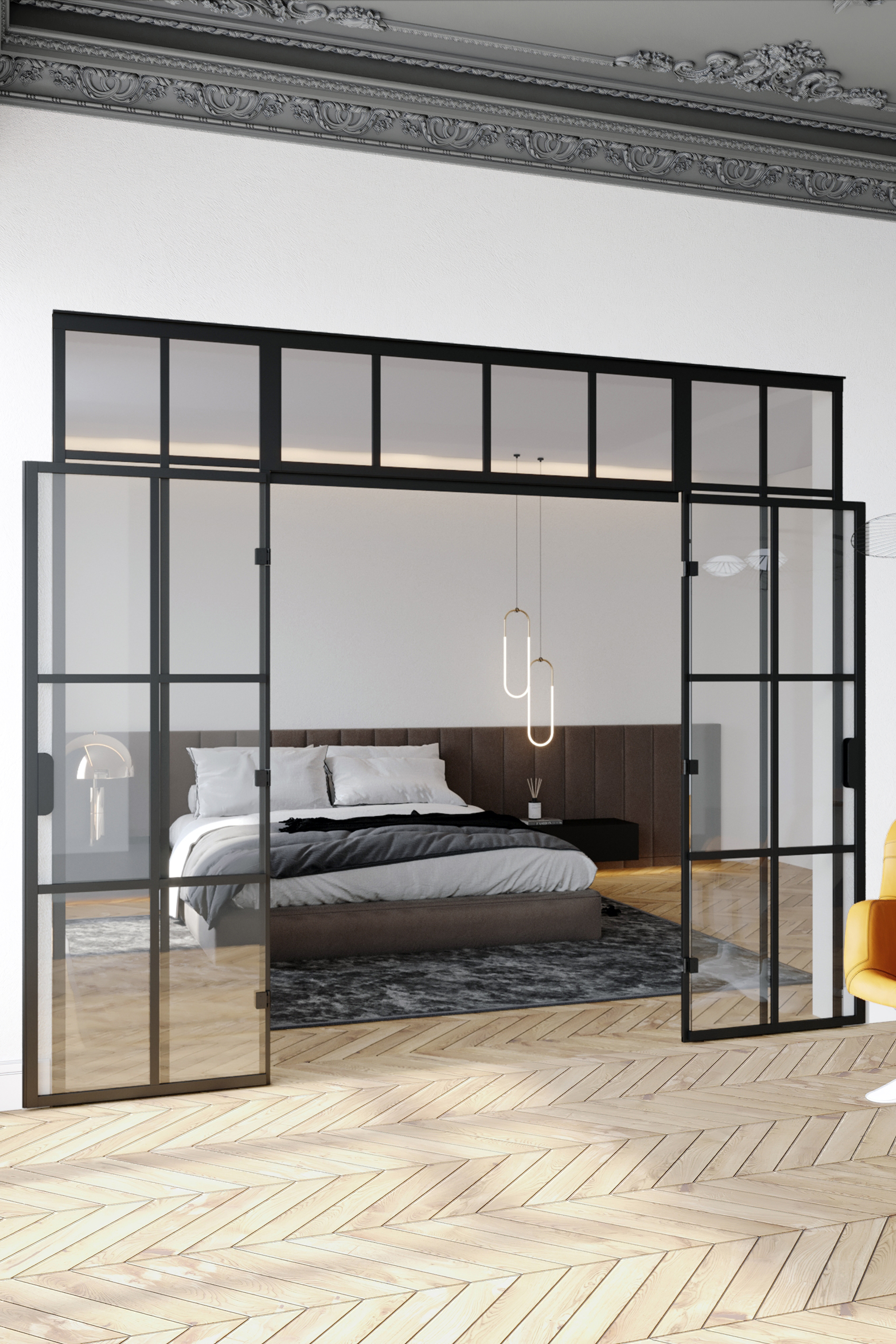 Glass wall with double door, fixed panels on 180 degree hinge sides and upper window