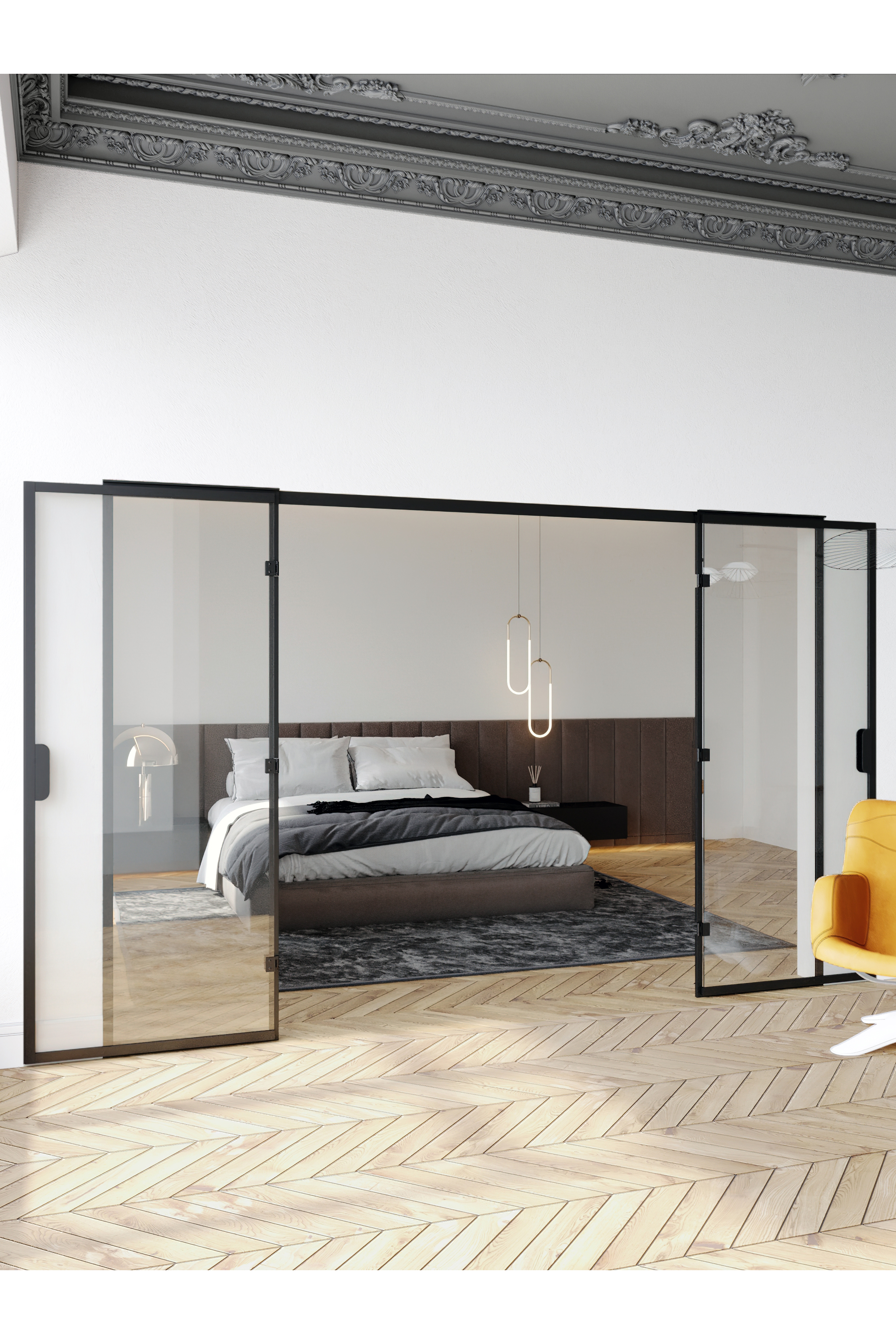 The glass wall configuration consists of a double door with fixed panels on both sides.