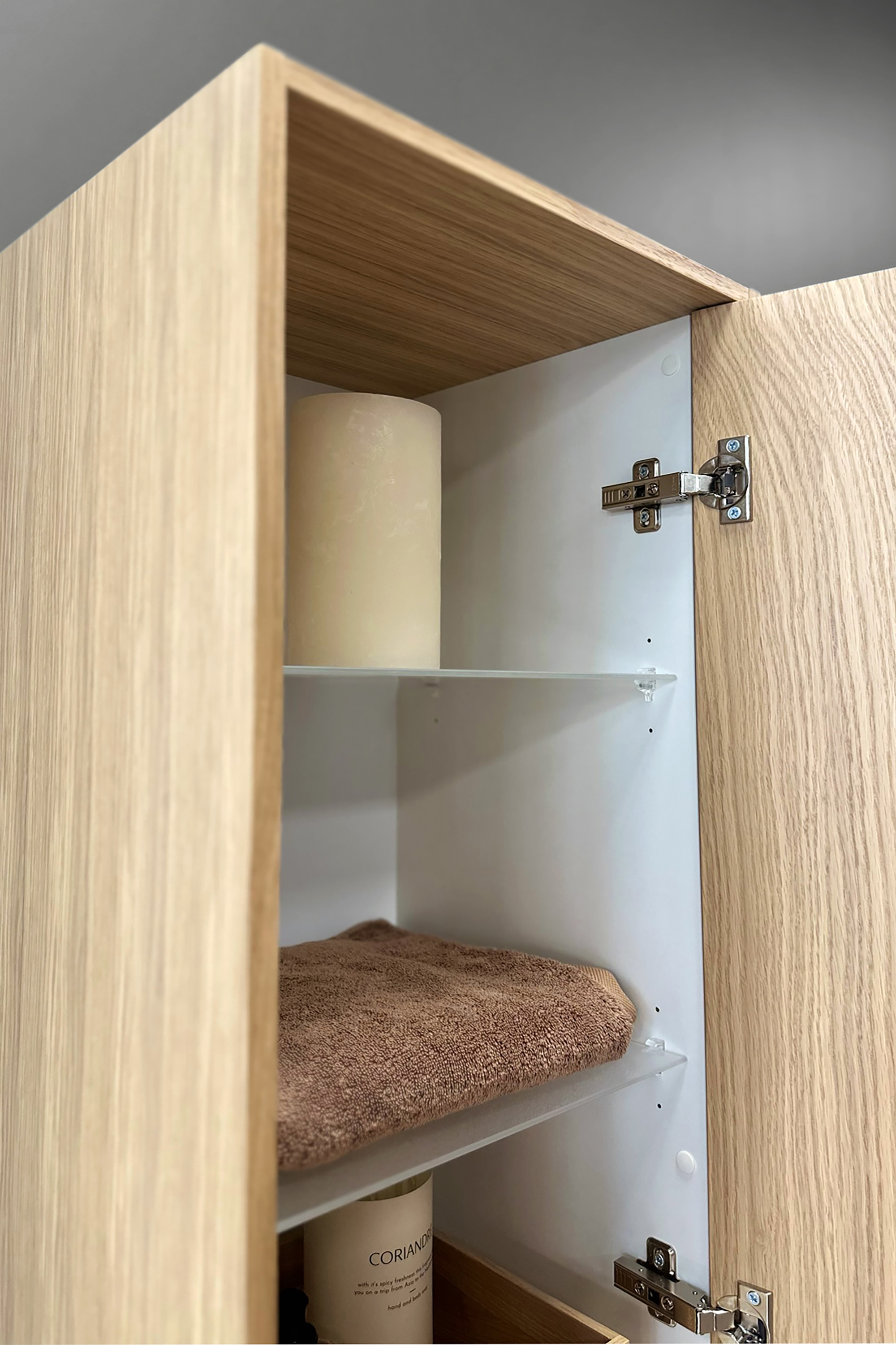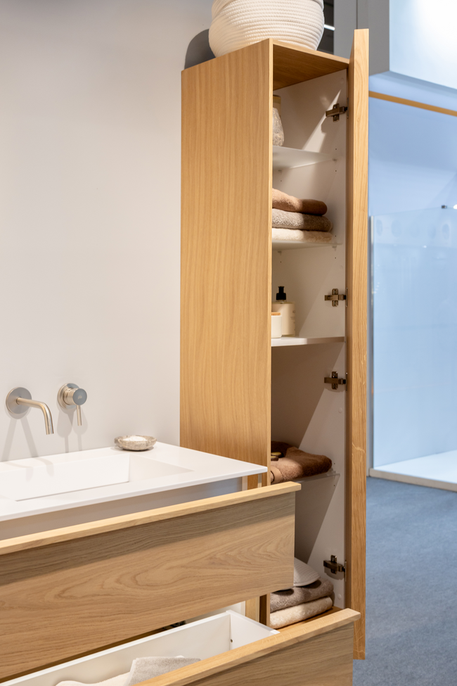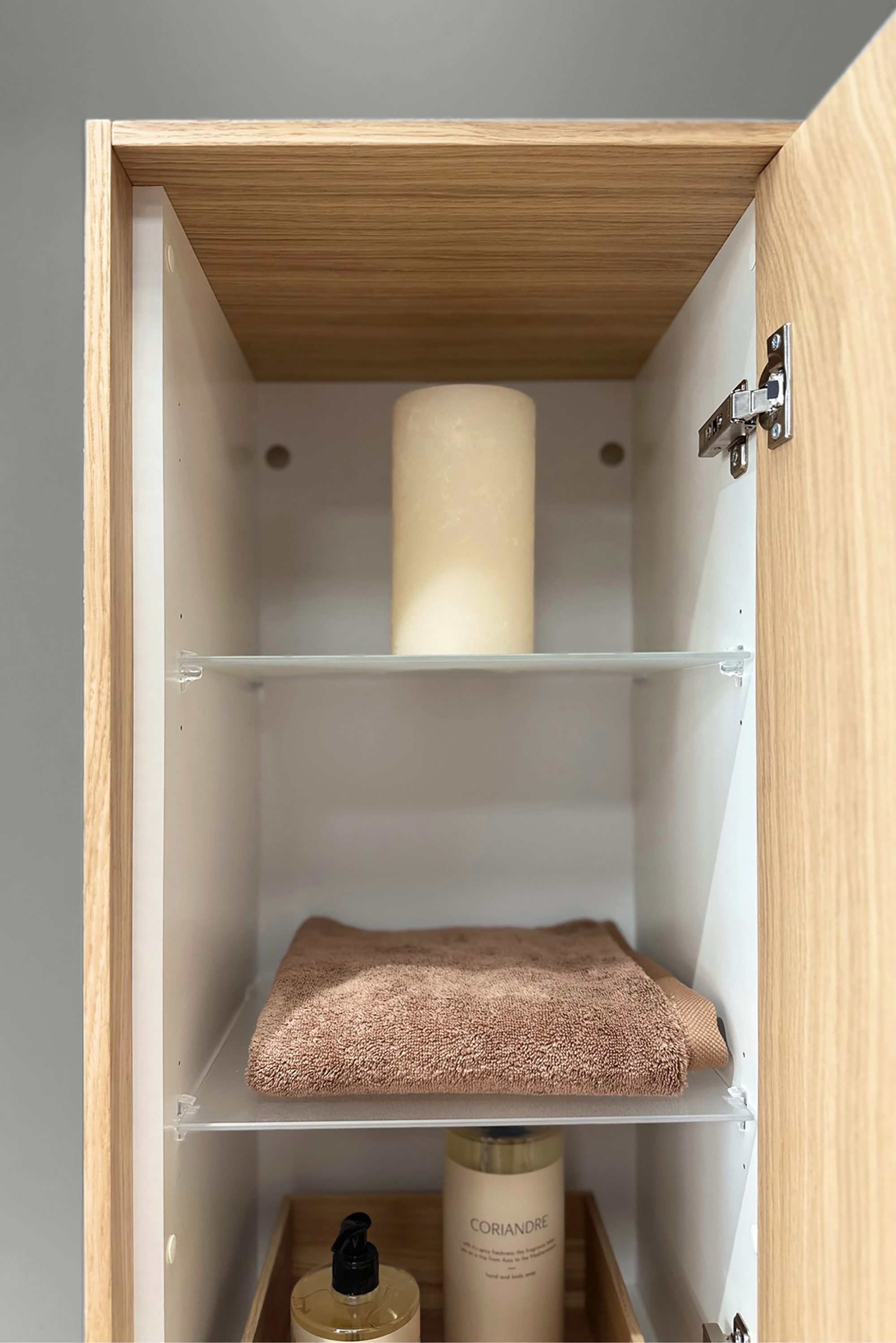 Tall unit bring more storage space to bathroom. Product surface materials are the same as in series vanity units. Tall unit is provided with one door and with an integrated wooden handle. Door handedness is selected when the unit is being mounted. The unit has three adjustable glass shelves.