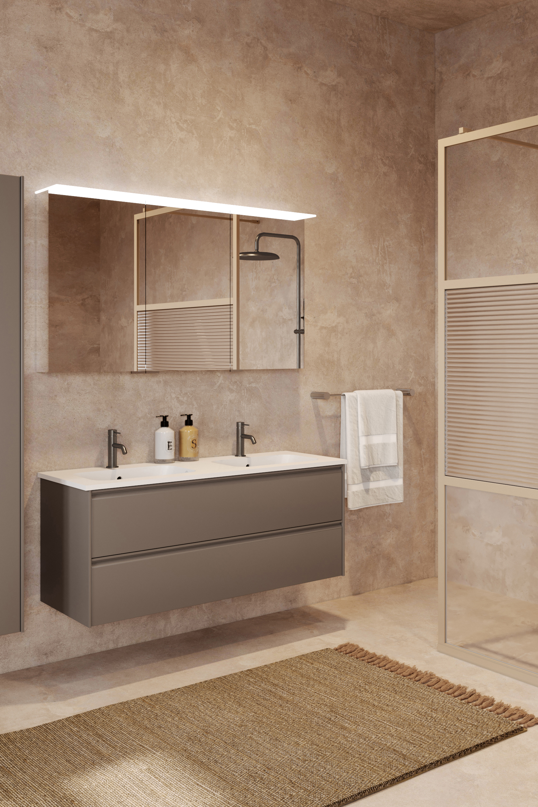 Luna is a minimalistic and modern vanity unit. Unit is provided with two spacious drawers with anti-slip mats and integrated metal handles. Simplified ceramic twin basin has a very low profile and stands out only 18mm from above the cabinet. A siphon set is included in the product with a chrome plated plastic bottom plug.