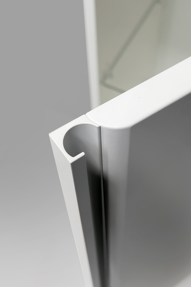 Tall unit bring more storage space to bathroom. Product surface materials are the same as in series vanity units. Tall unit is provided with two doors and and integrated metal handles. Door handedness is selected when the unit is being mounted. Unit has three adjustable glass shelves.