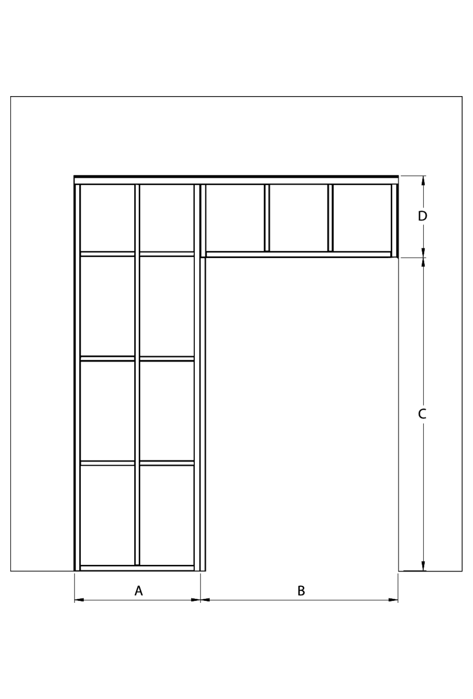 The wall panels are mounted to the building wall on each side of the enclosure using wall mounting profiles and floor fitting profiles. The panels and the upper window are secured with self-drilling screws. The top of the unit is secured to the ceiling by long profiles, covering the top of the unit and by a short profile, covering bottom window edge from both sides.