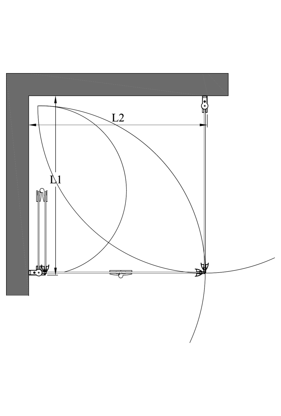 Doors rotate 90 degrees in both directions and are equipped with adjustable centrings. The function of the centring is to return the door to the open and closed positions. positions. In addition, the outer panel of the folding door rotates 180 degrees in relation to the inner panel so that the panels fold against each other into the interior portion of the shower area. A pair of magnet handles keeps the doors tightly closed during showering.