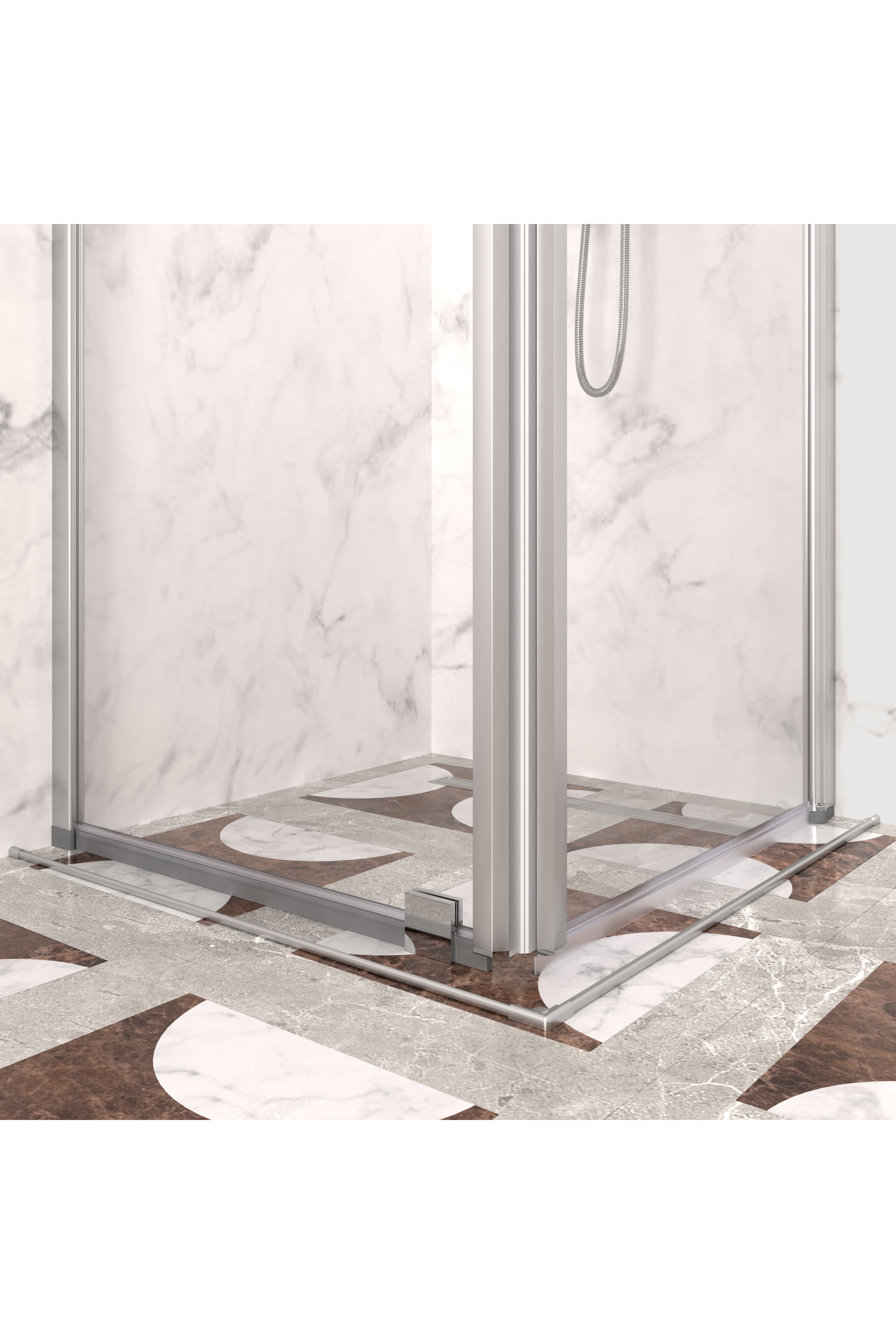 The product is supplied as standard with a 33 mm high floor seal. The optional accessories are a 50 mm high floor seal for shower areas where the floor tilting is higher than normal. The length of the floor seal is 1000 mm and it is cut to a suitable length on site. The watertight quality of the product can be improved by installing a step profile under the door. The step profile is cut into a suitable length on the side and glued to the floor. The height of a shaped step profile is 10 mm and its width is 16 mm.