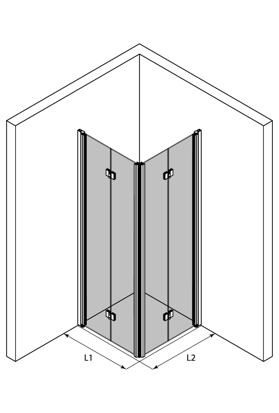 Shower enclosure consists of two folding doors. The product is well-suited for a shower corner where doors may not have the space to properly open outwards. Folding door does not require space for opening from outside the shower area but the door folds inside the shower area so that the door panels fold into a small space against the wall of the building. The doors can be dimensioned symmetrically or so that the doors are of different sizes. When the shower is not in use the doors can be turned in against the building walls.