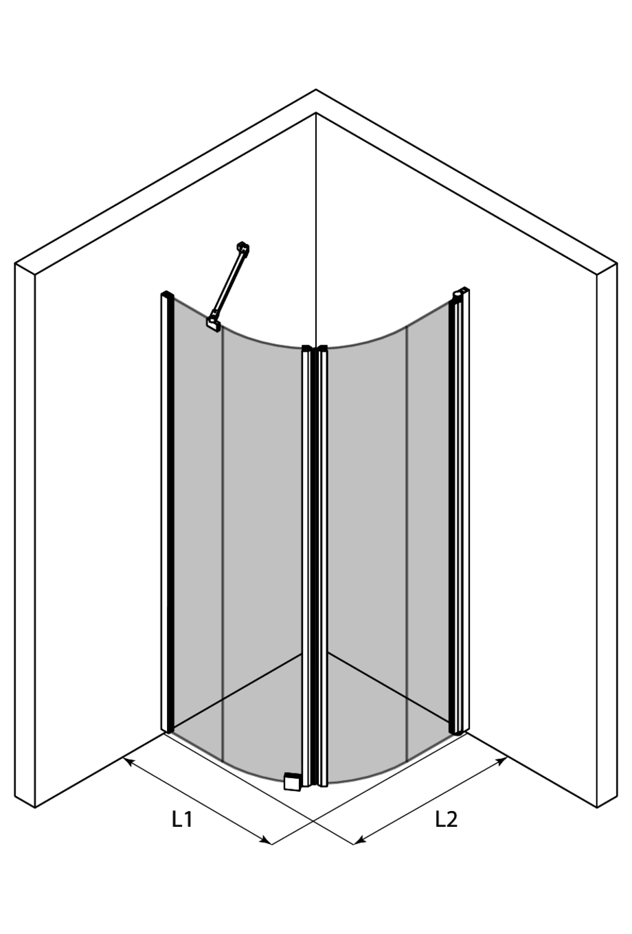 Shower enclosure consists of a fixed wall and a hinged door Product is well-suited for a shower corner with fixtures next to it. Fixed wall and door can be dimensioned so that the fixed wall protects the fixtures and the door is of the same width as the available space.