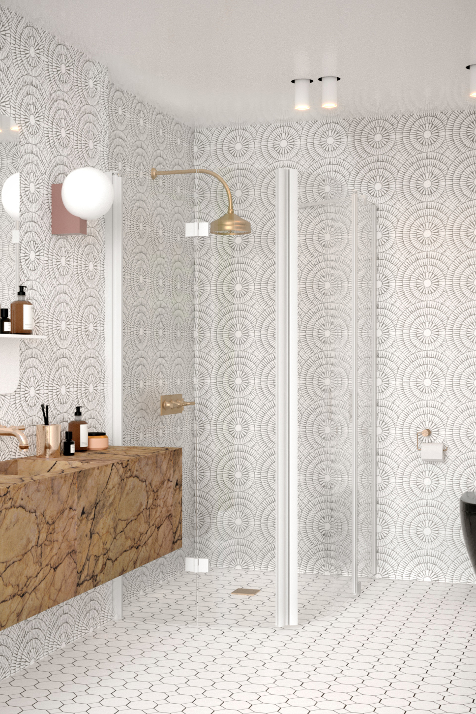 Curved shower enclosure with a folding door and a hinged door with a fixed part