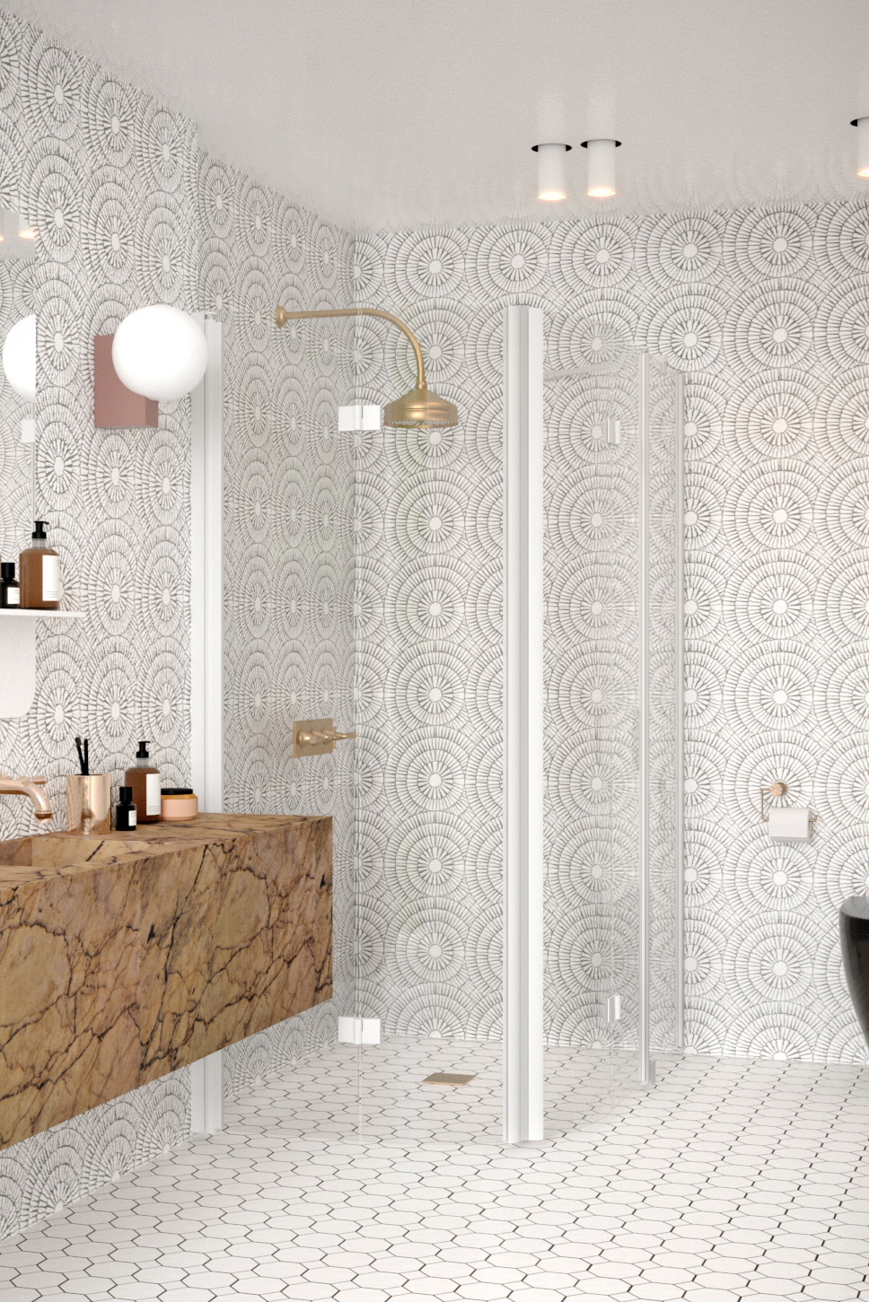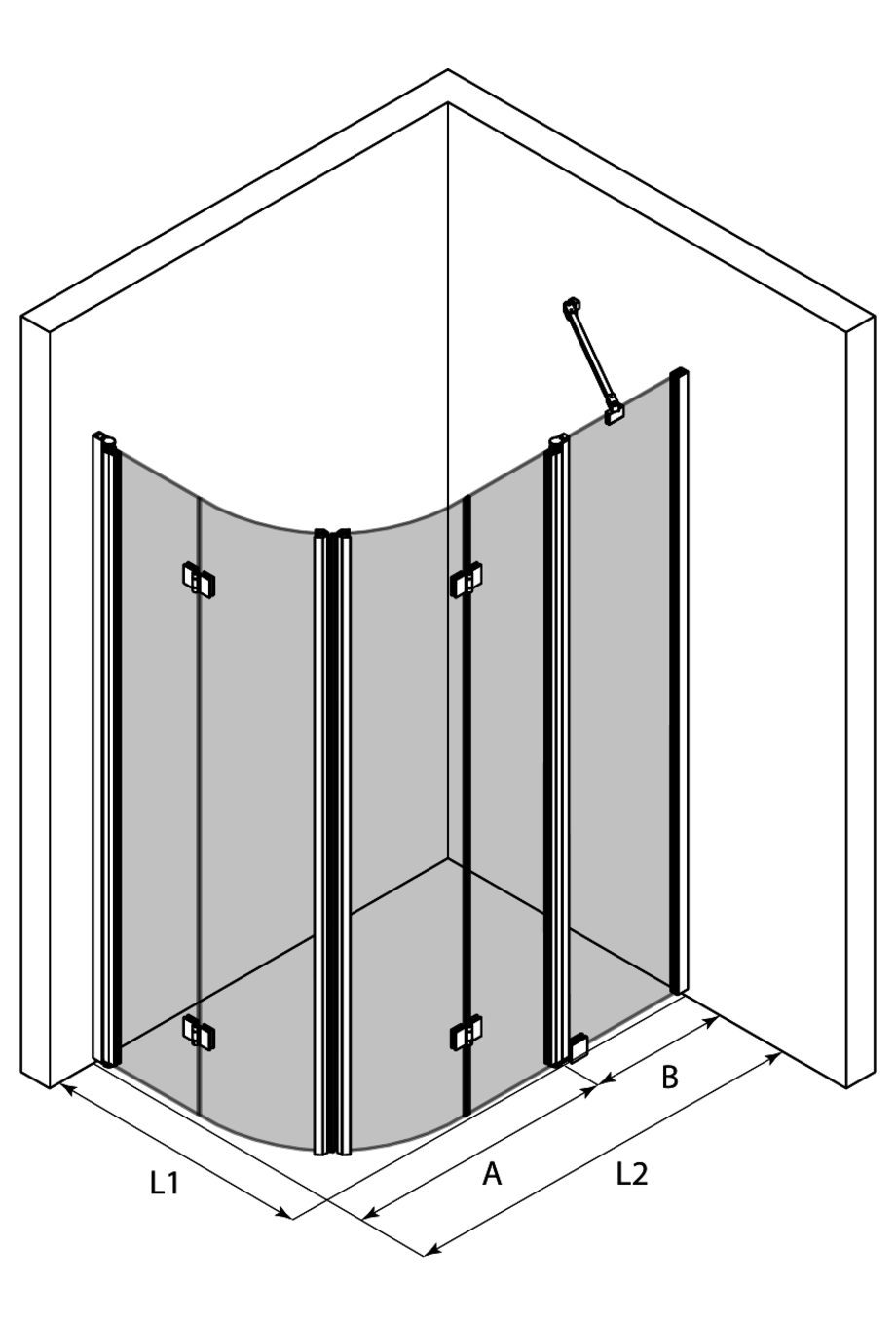 Doors rotate 90 degrees in both directions and are equipped with adjustable centrings. The function of the centring is to return the door to the open and closed positions. positions. In addition, the outermost panels turn in relation to the innermost panels so that the panels of the doors fold against each other to the internal side of the shower area. A pair of magnet handles keeps the doors tightly closed during showering.