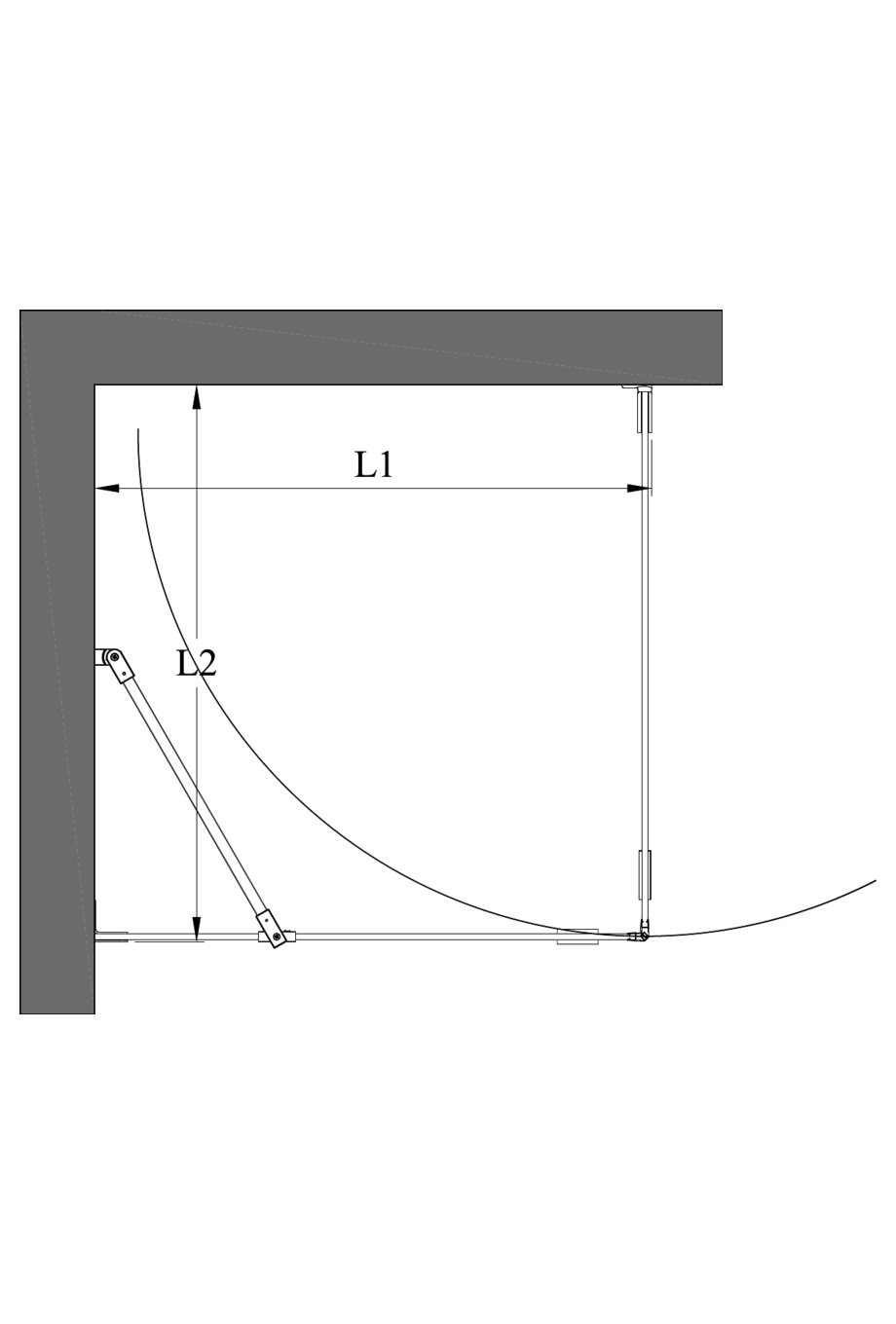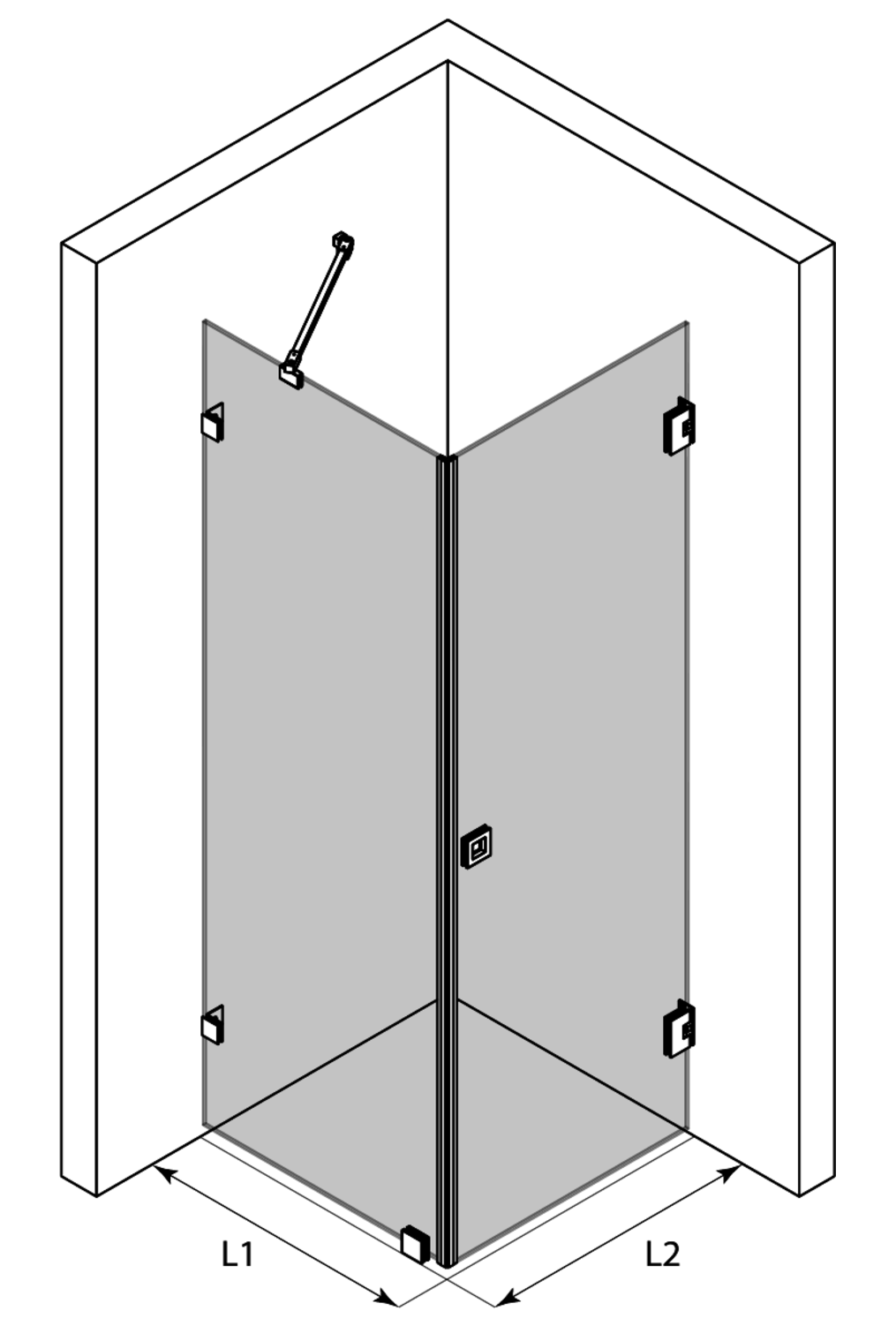 Fixed wall and door are attached to the wall of the building from the sides by means of wall mountedfittings and hinges. The fixed wall is supported from the top edge by a brace installed in the corner and from the bottom edge by a fitting glued to the floor. Between the panel of the fixed wall and the floor will be a 25mm high gap. Between the panel and the floor may be installed a seal (standard part) in order to prevent water from passing through under the panel. At the bottom edge of the door panel can be installed which restricts the flow of water. Installation guide