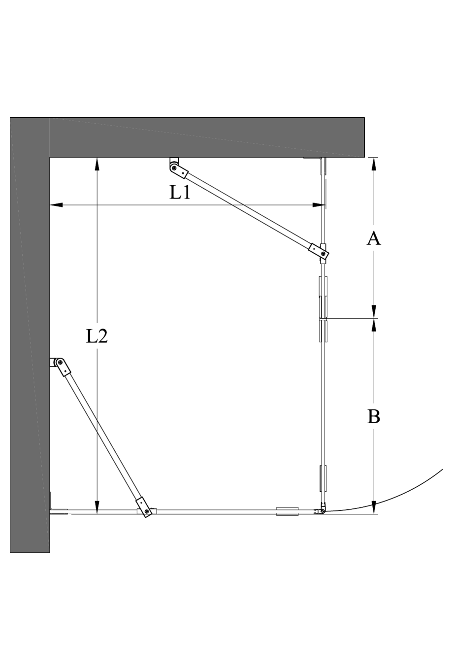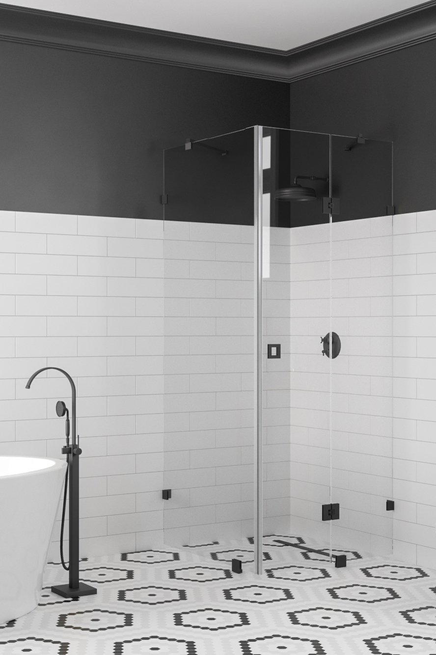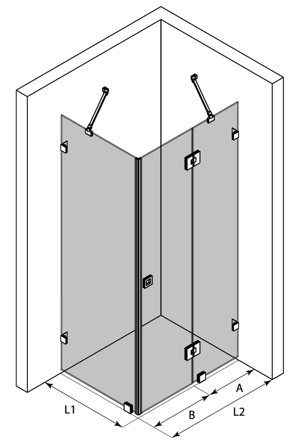 The shower enclosure consists of two fixed walls, into one of which a hinged door has been attached. The product is well-suited for a shower corner on the outside of which are fixtures on both sides. Fixed walls can be measured according to the depth of the fixtures so that when opened, the door does not hit the fixtures
