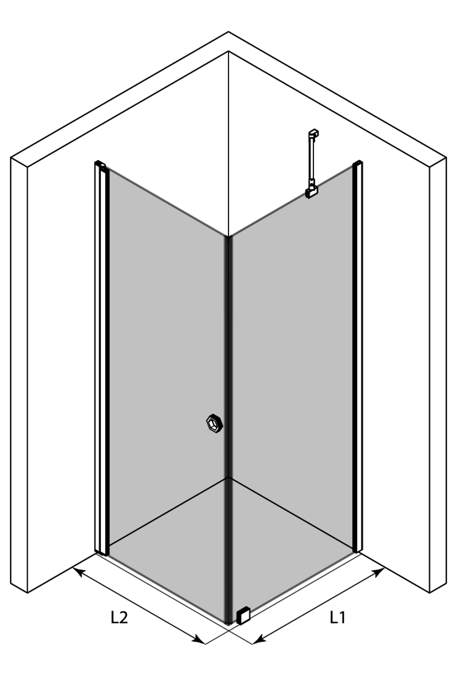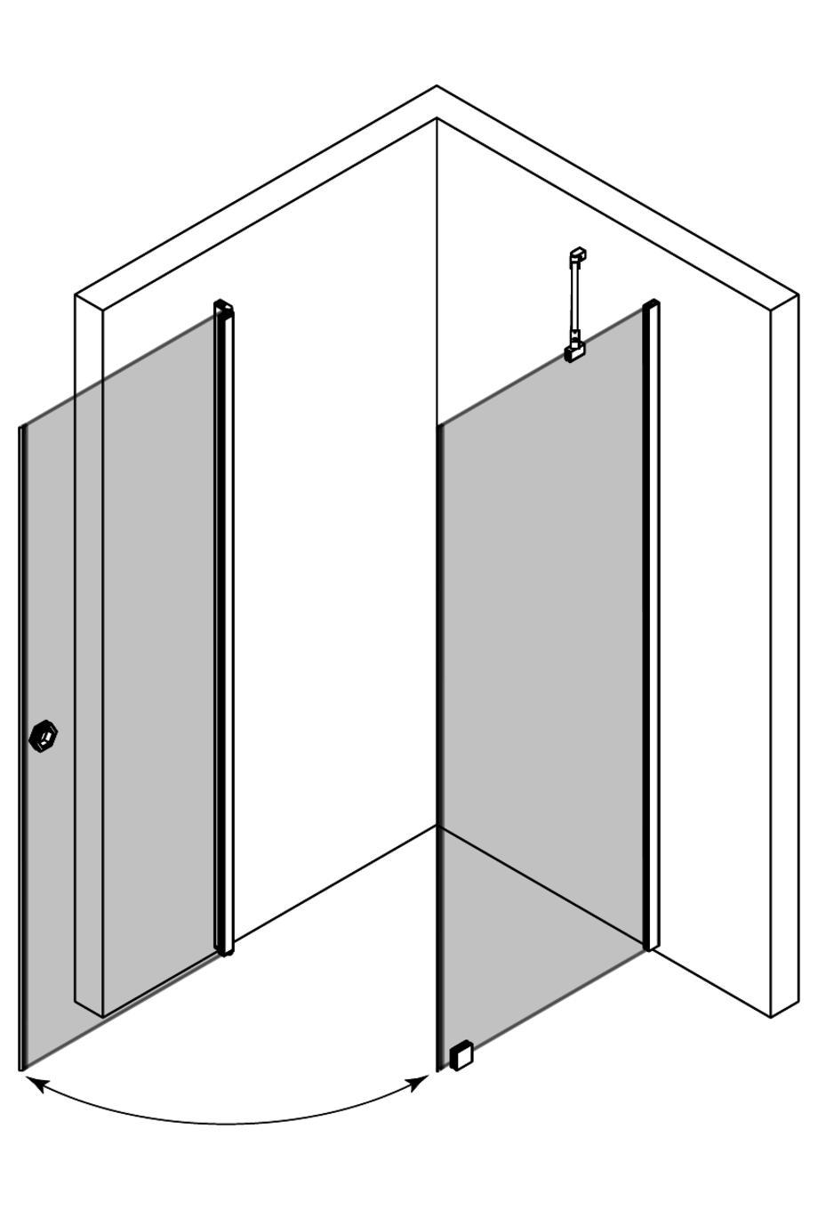 Shower enclosure consists of a fixed wall and a hinged door Product is well-suited for a shower corner with fixtures next to it. Fixed wall and door can be dimensioned so that the fixed wall protects the fixtures and the door is of the same width as the available space.