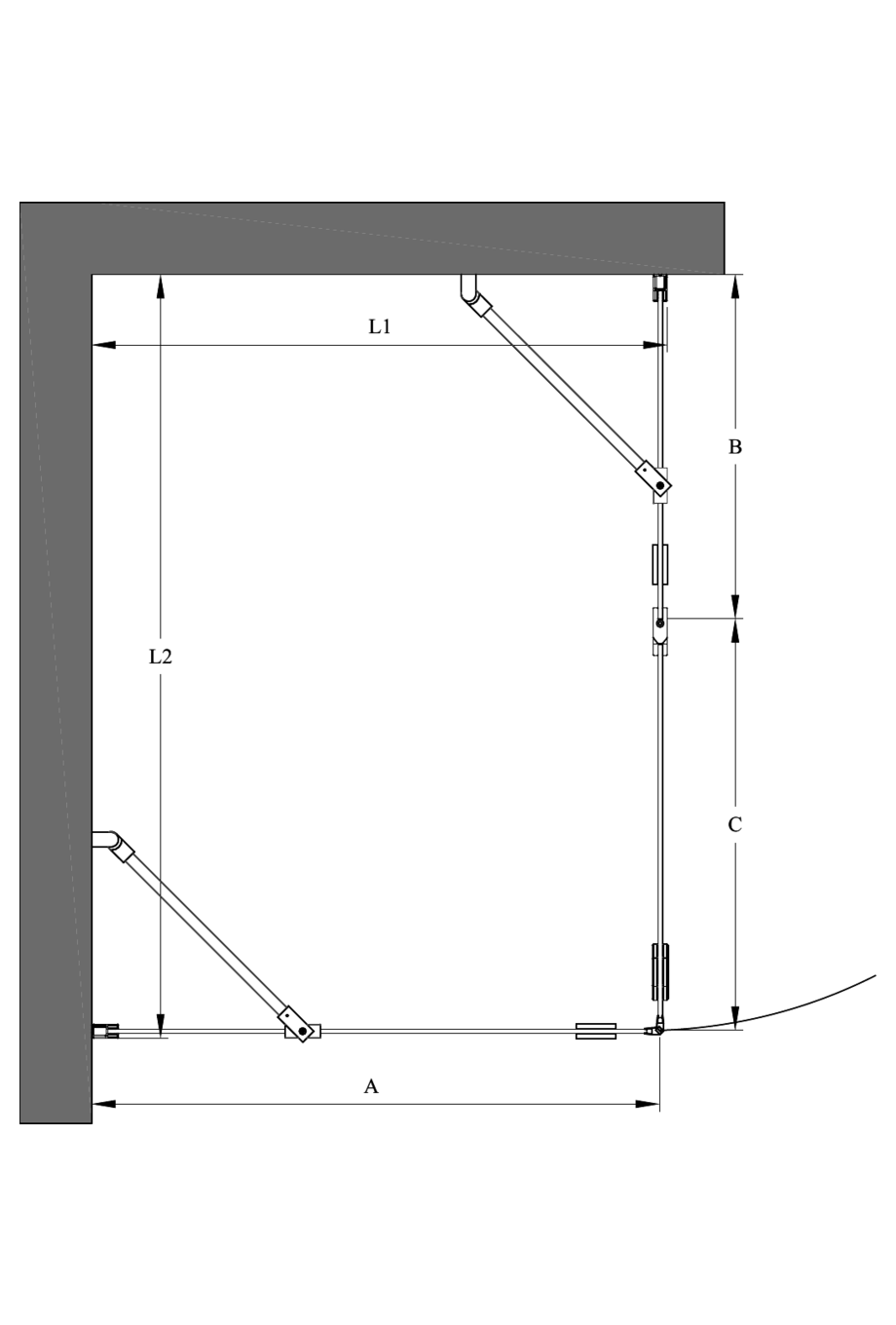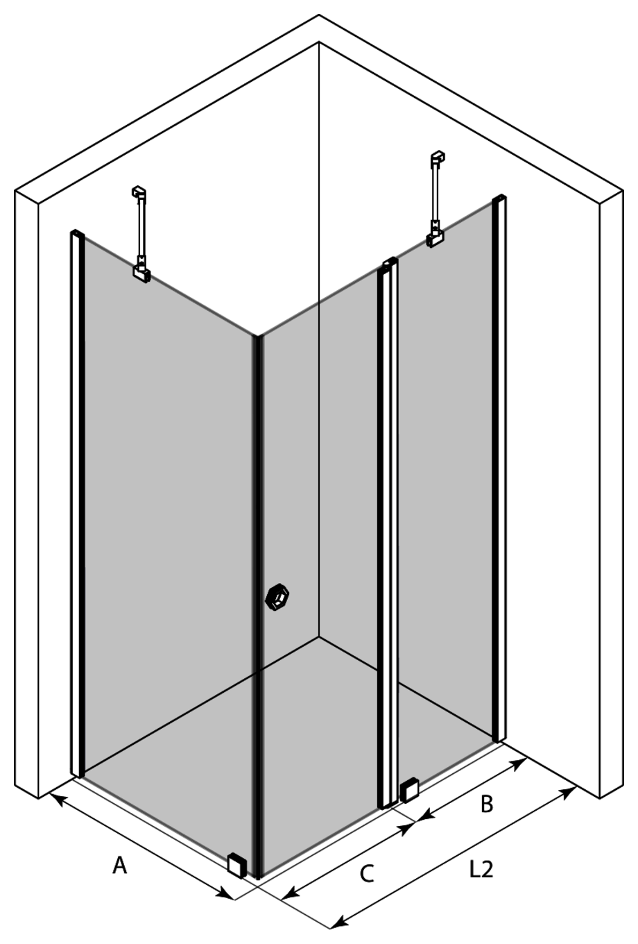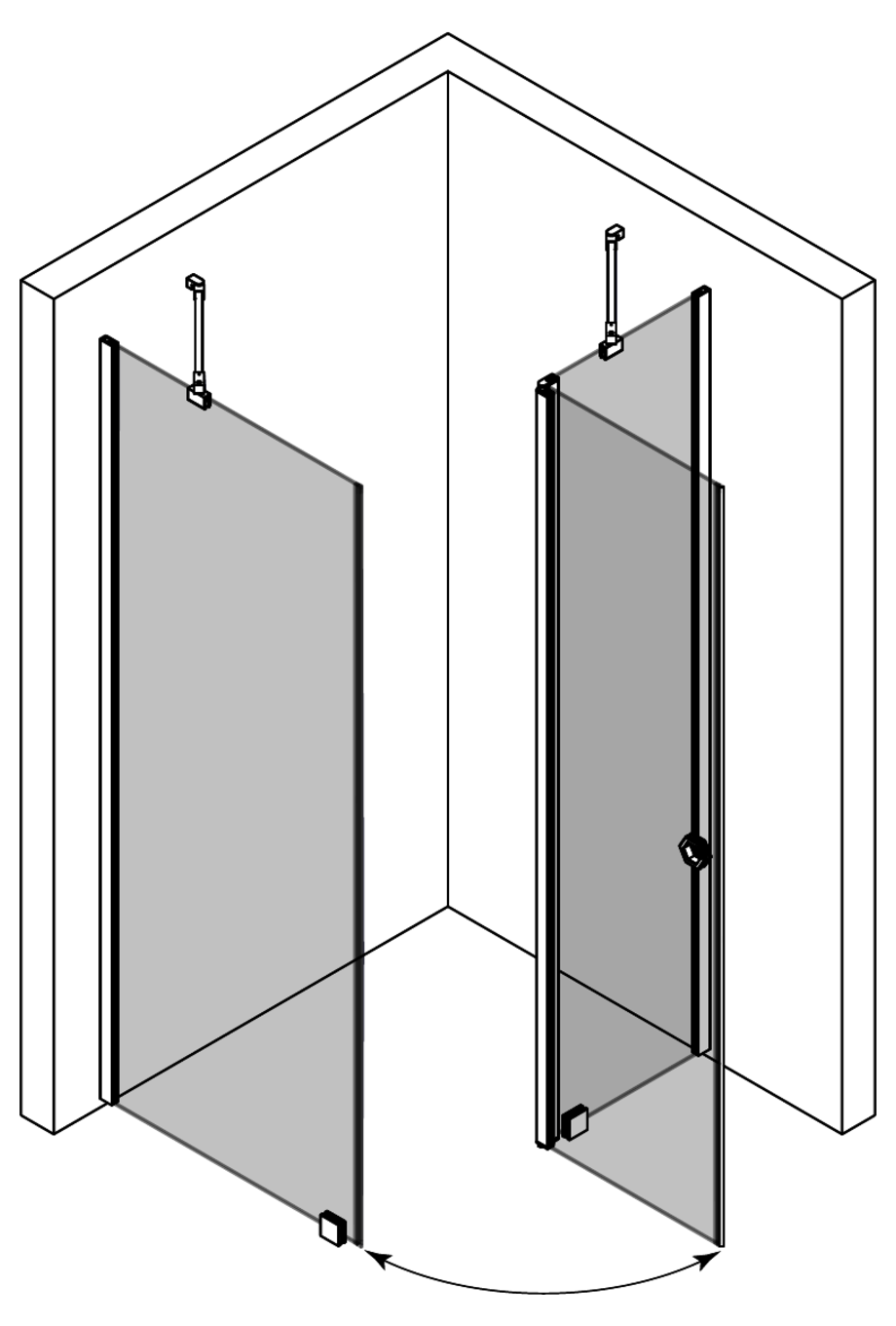 The shower enclosure consists of two fixed walls, into one of which a hinged door has been installed. The product is well-suited for a shower corner wherefixtures are on both sides of the space. Fixed walls can be measured according to the depth of the fixtures so that when opened, the door does not hit the fixtures. The door opens 90 degrees to the outside and is equipped with an adjustable centring. The function of the centring is to return the door to the open and closed positions. A pair of magnet seals keeps the doors tightly closed during showering.